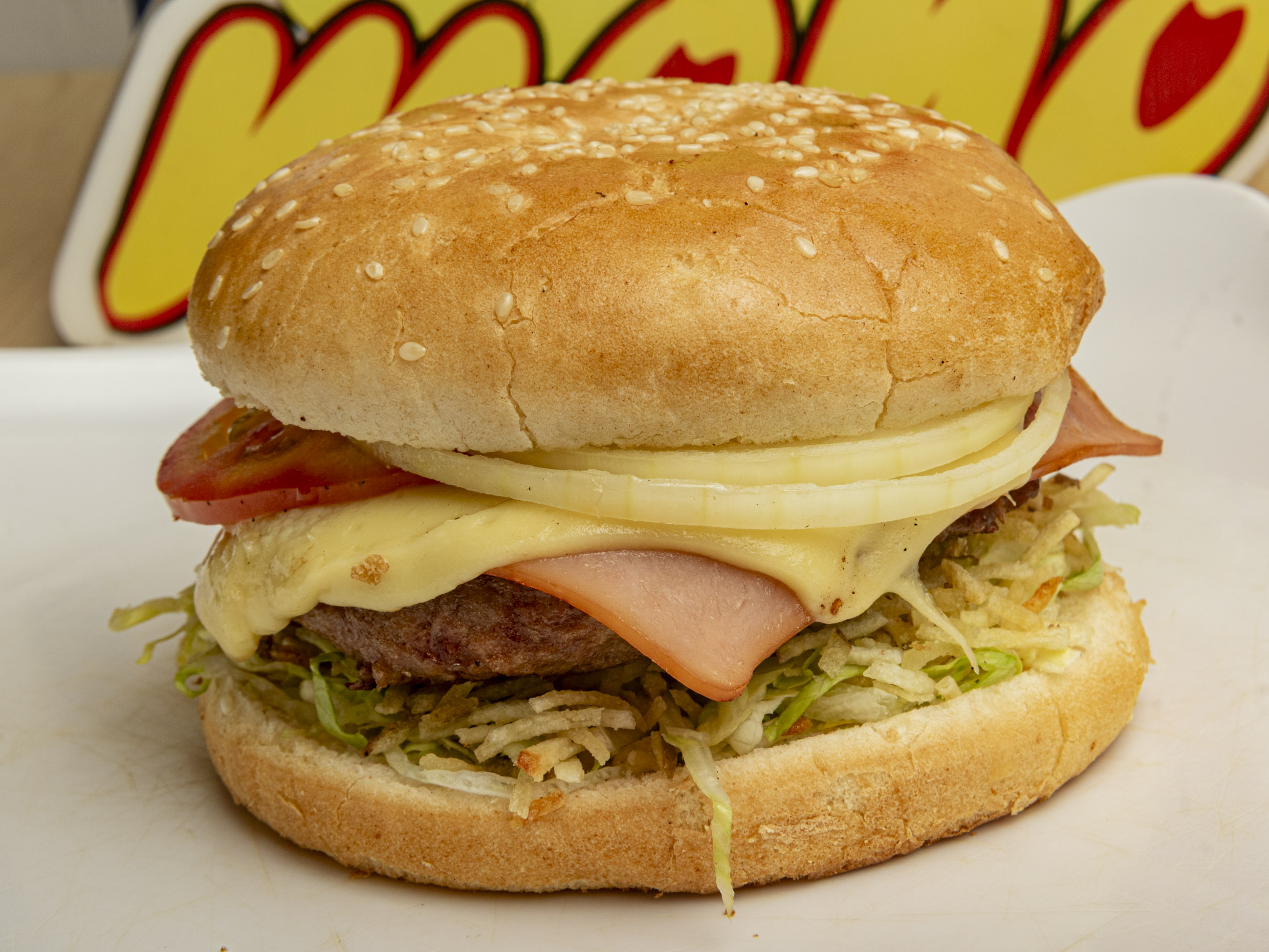 Pan bimbo, queso mozzarella, jamón pietran, lechuga, cebolla, tomate, salsa rosada y doble carne.