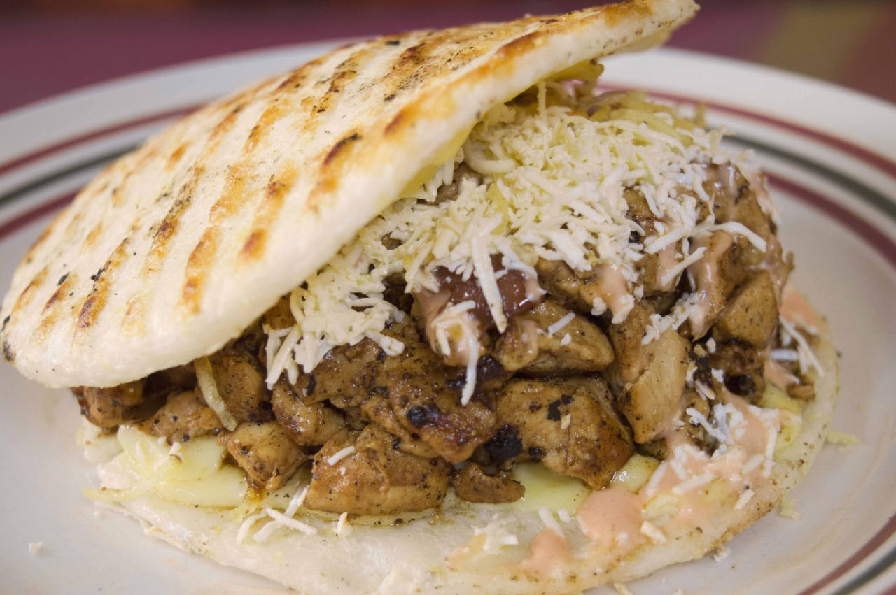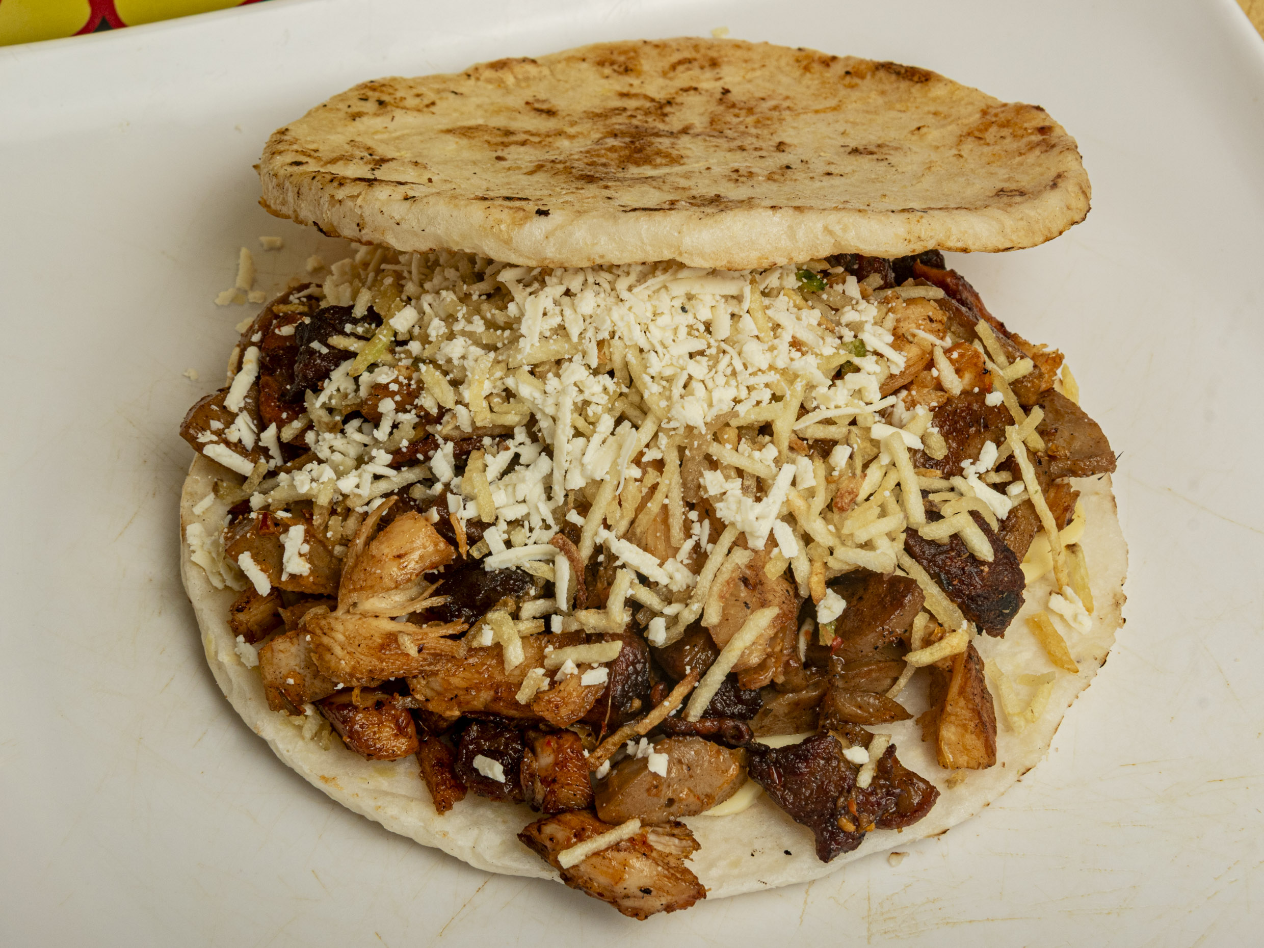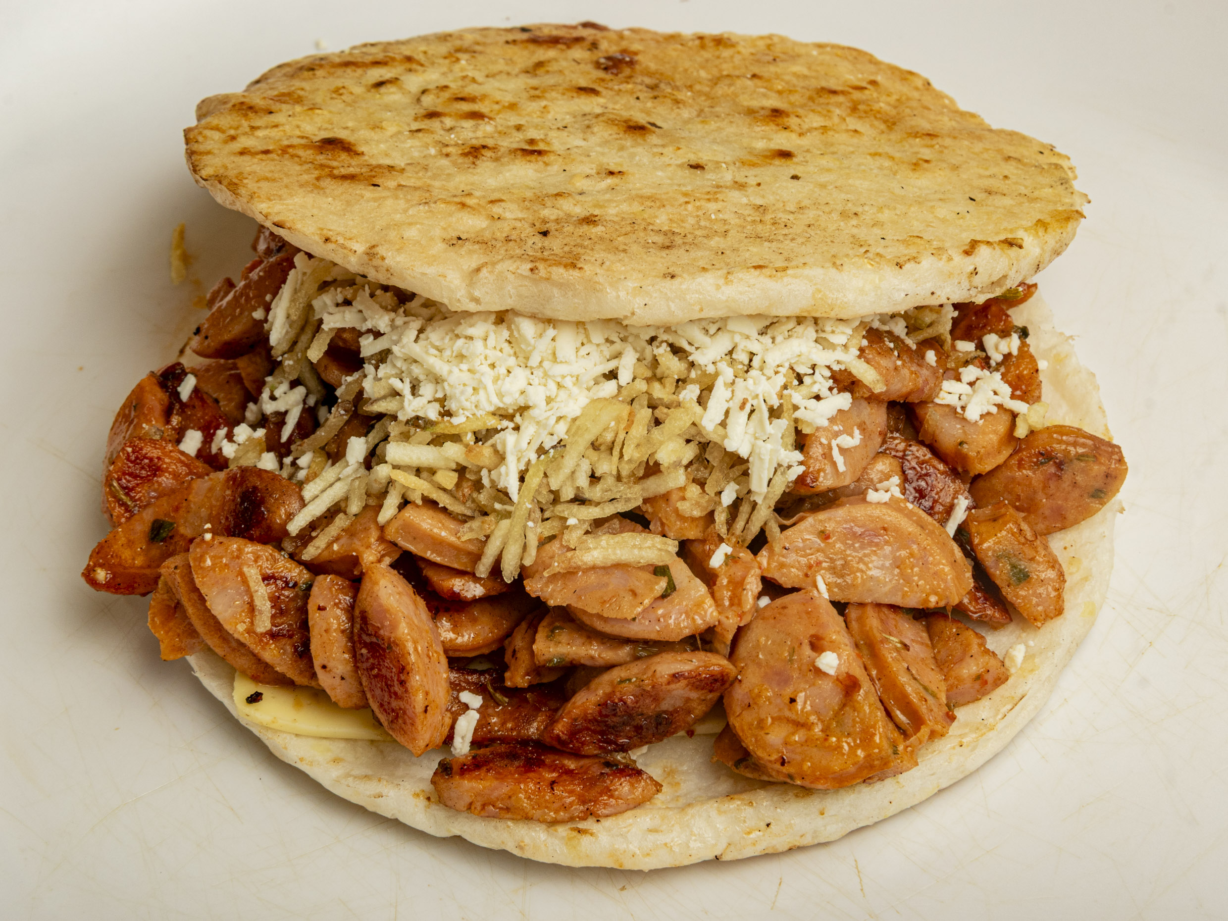 Arepa con carne , pollo, chorizo y butifarra zenu, queso mozarella, papas chips, salsas de la casa
