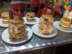 Pan bimbo, queso mozzarella, jamón pietran, lechuga, cebolla, tomate, salsa rosada y carne.
