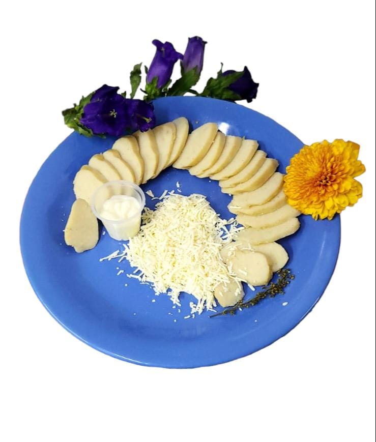 arepa, chorizo zenu, queso rayado ,papas chips, salsa de la casa y salsa rosada