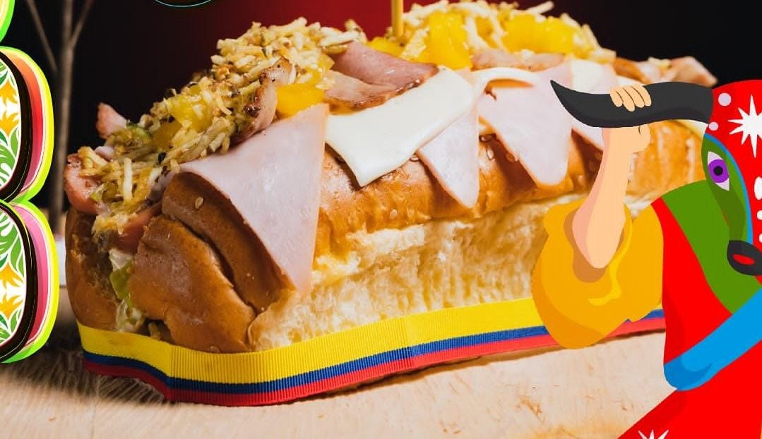 Perro en pan Bimbo, salchicha long, tocineta, jamón pietran, piña en trozos, queso mozzarella.