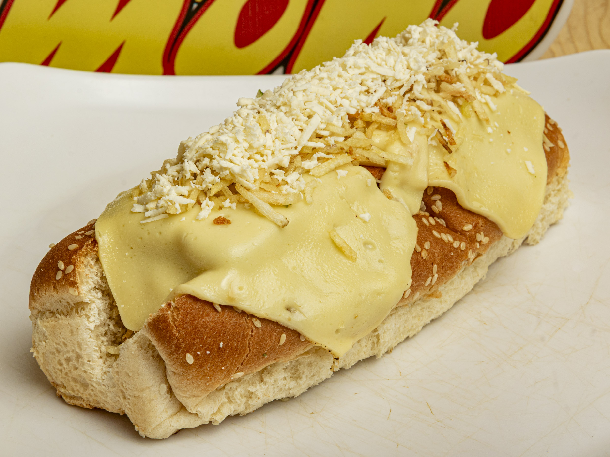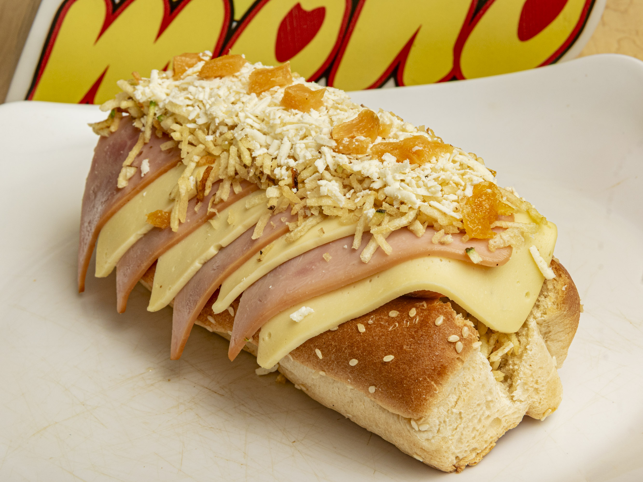Perro en pan Bimbo, salchicha long, carne, pollo, chorizo, butifarra, mozzarella, jamón pietran.