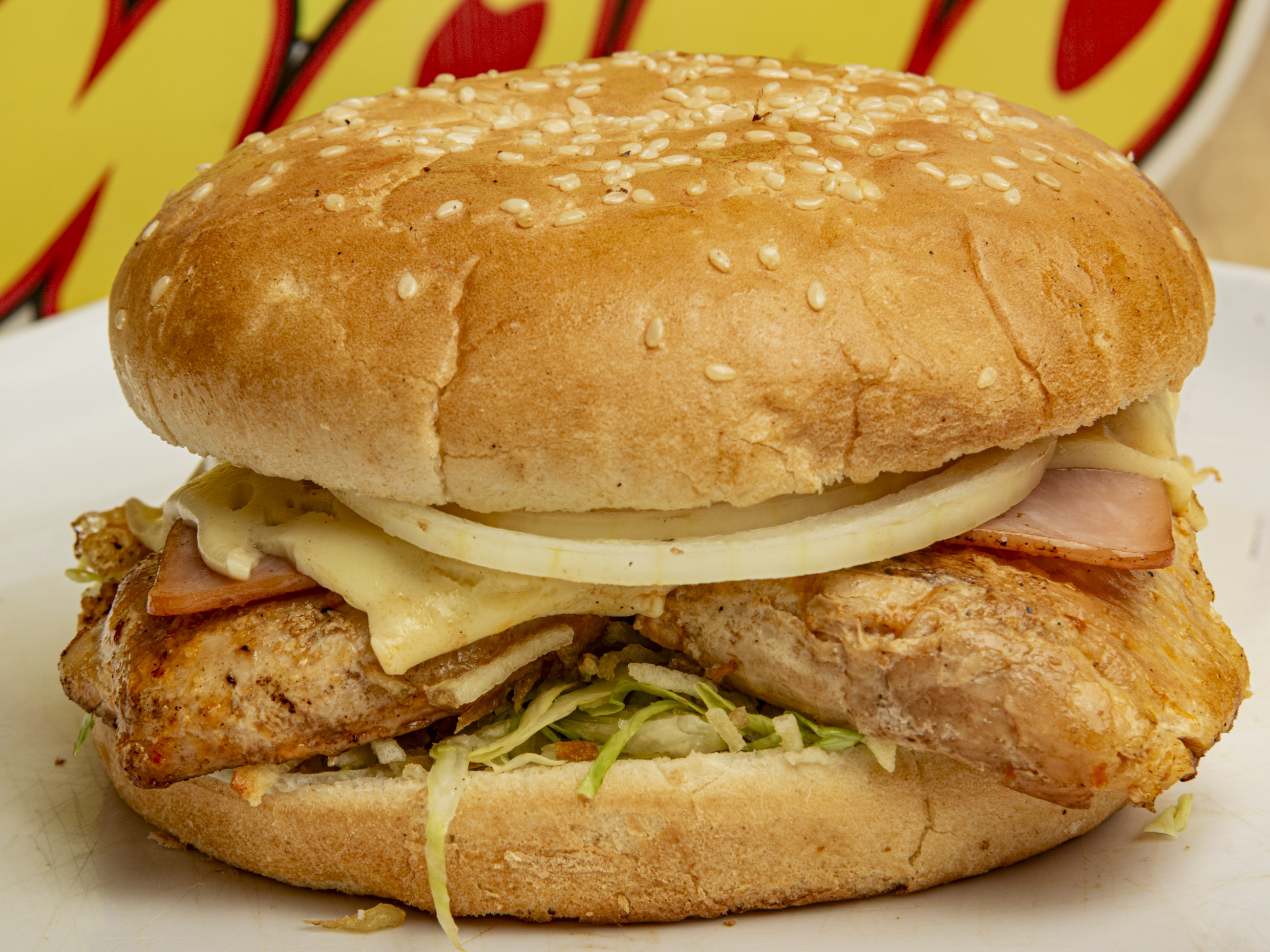 Pan bimbo, queso mozzarella, jamón pietran, lechuga, cebolla, tomate, salsa rosada y doble pollo.