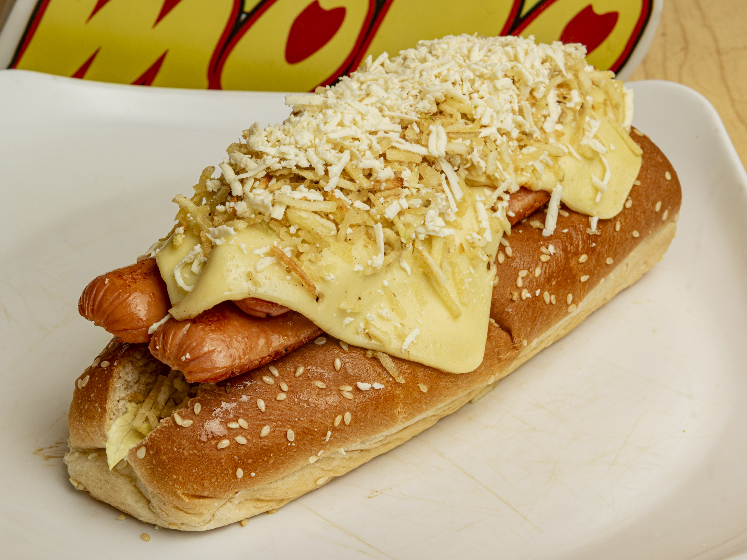 Perro caliente con salchicha tipo Long, echuga, salsas de la casa, papa cabello de ángel o ripio, carne molida, queso tipo mozzarella, tocineta