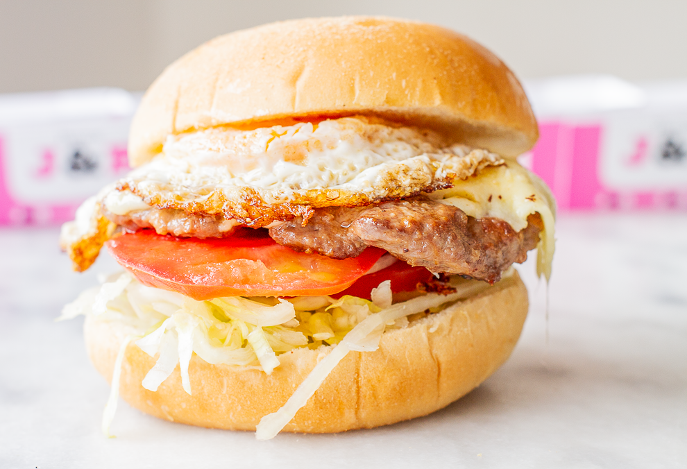 Hamburguesa con carne J&R, queso, cebolla, tomate, lechuga y salsas.