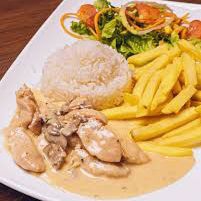 130 g Filete de pollo, salsa de champiñones, arroz blanco, ensalada, papa francesa, salsa de la casa y gaseosa 250 ml (manzana, Colombiana, Pepsi).