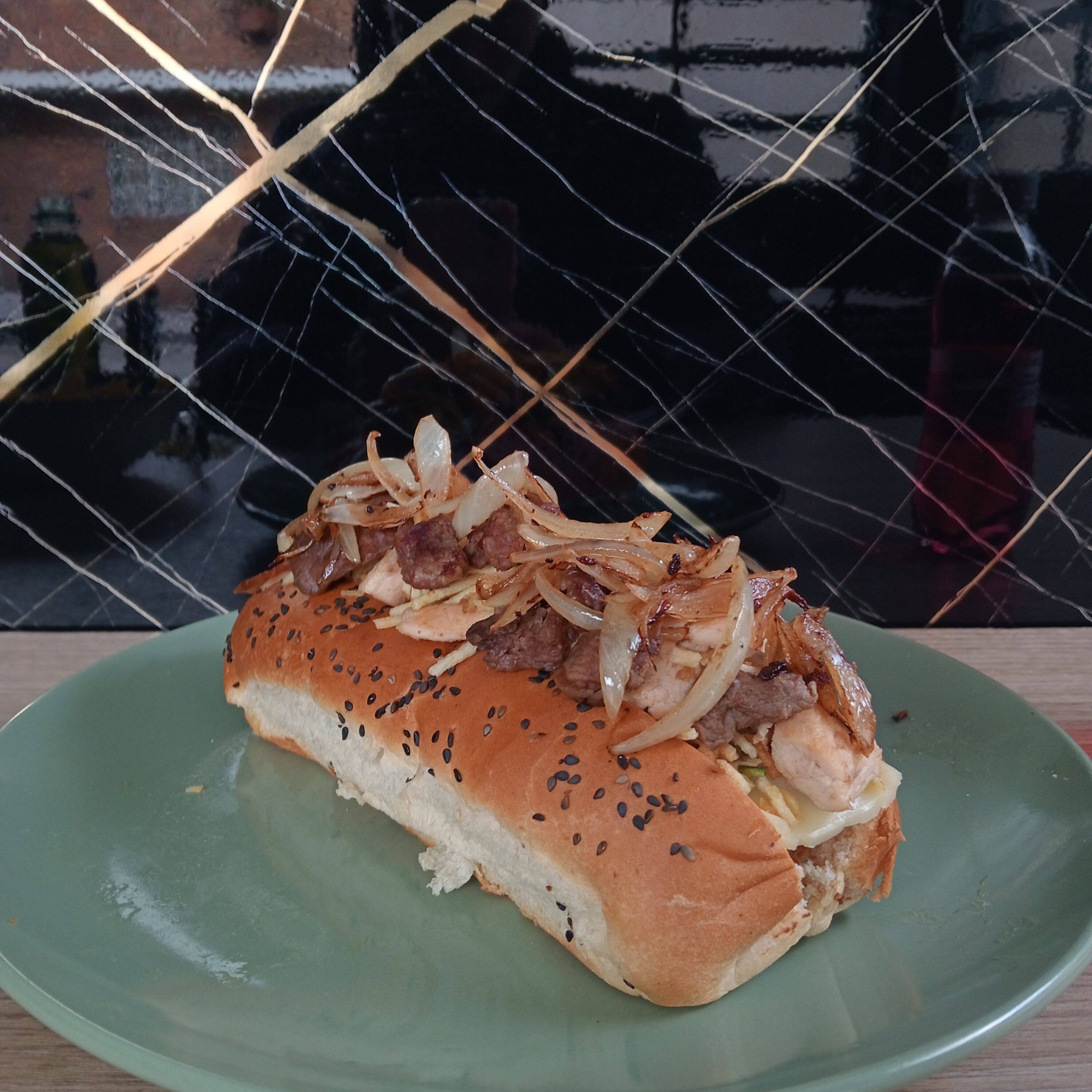 Salchicha americana, pollo salteado, carne salteada, cebolla caramelizada, cabello de ángel, queso doble crema, salsas (tomate, BBQ, salsa de piña y salsa de ajo).