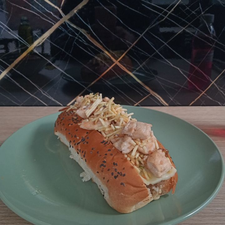 Filete de pollo 100 g, tocineta, pan brioche, queso doble crema, salsas (tomate, BBQ, de la casa), lechuga y tomate.