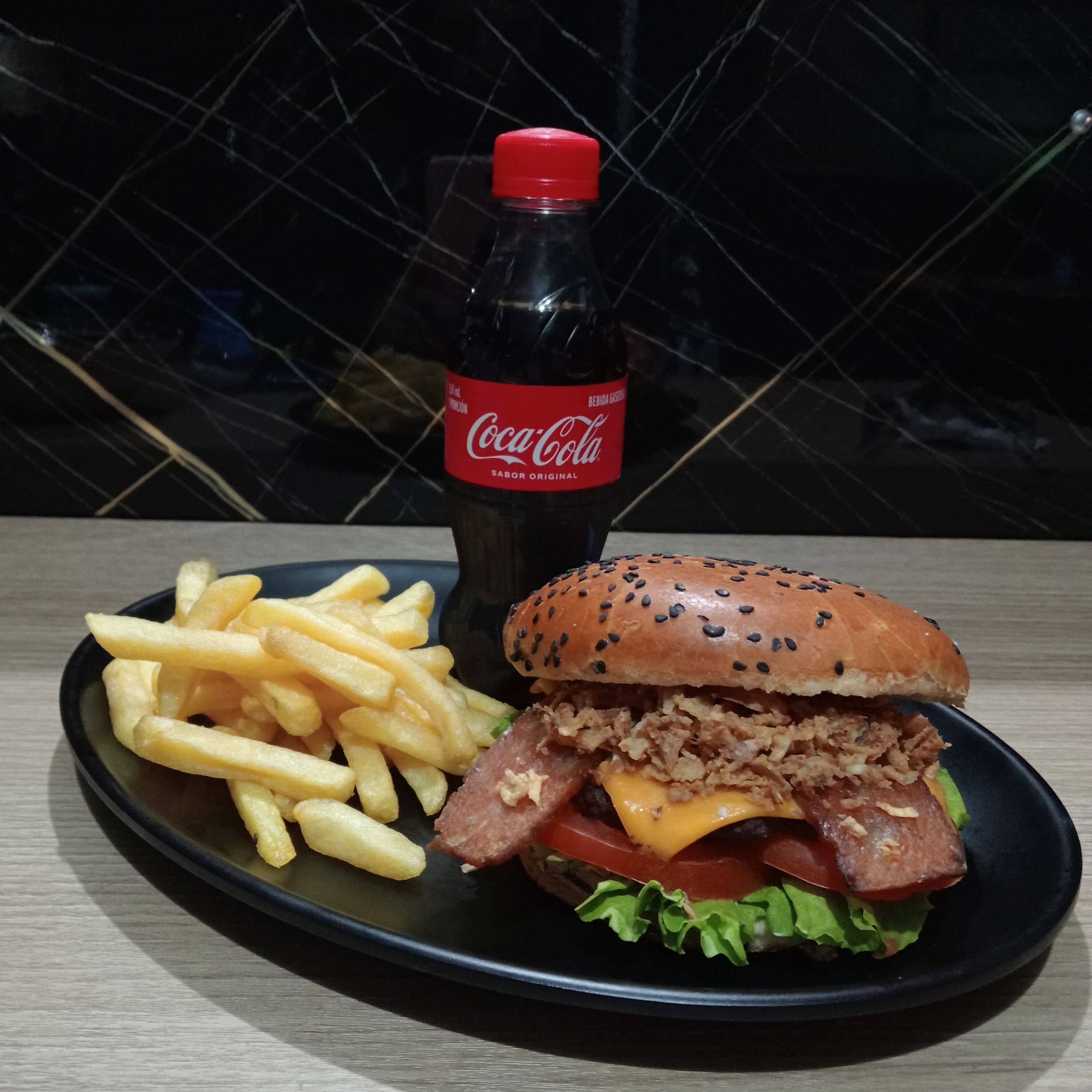 Carne artesanal 120 g, tocineta, cebolla crispy (caramelizada), pan brioche, queso doble crema, salsas (tomate, BBQ, de la casa), lechuga y tomate, papas a la francesa y gaseosa 250 ml (manzana, Colombiana, Pepsi).