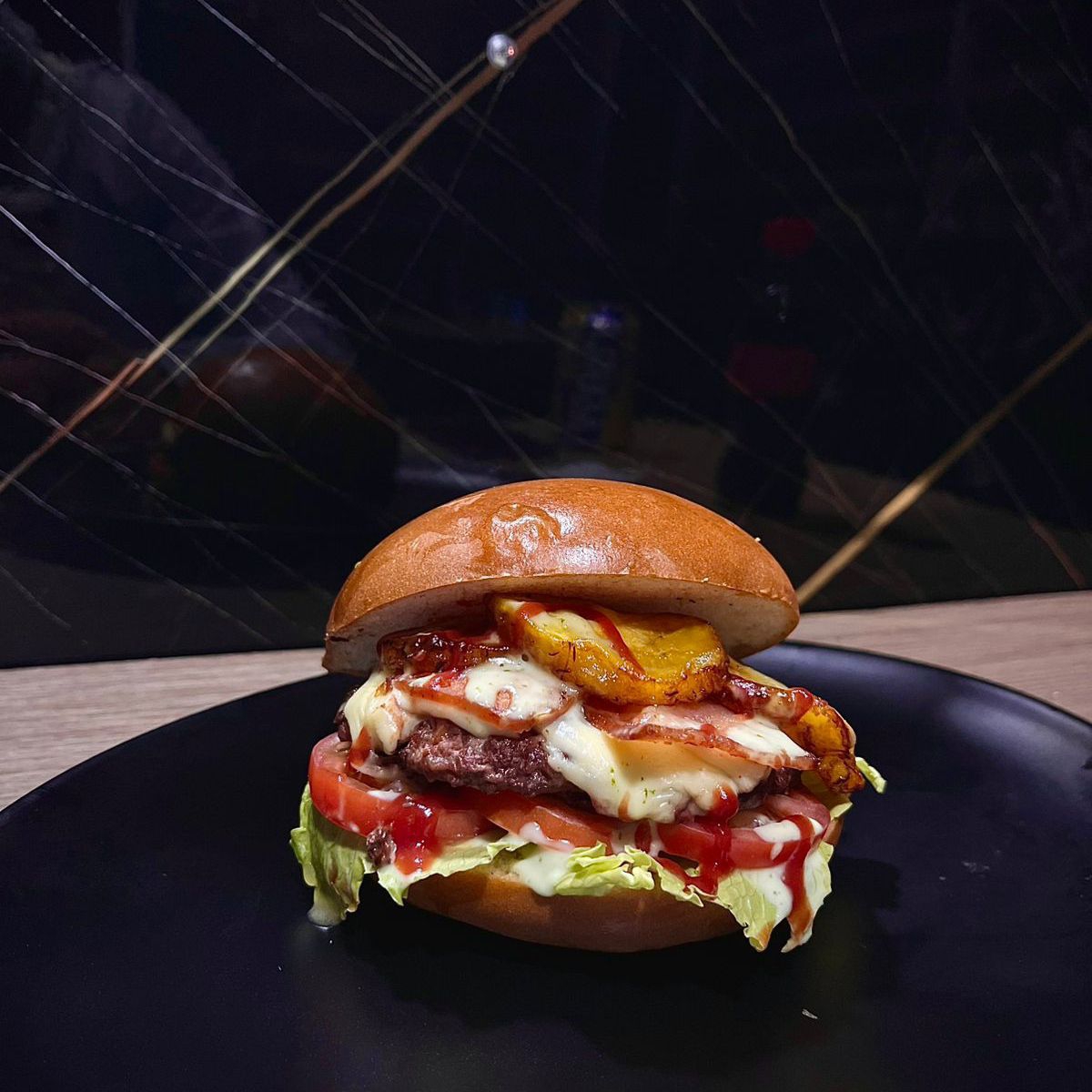 Carne artesanal 120 g, tocineta, plátano frito, queso costeño, pan brioche, queso doble crema, salsas (tomate, BBQ, de la casa), lechuga y tomate.