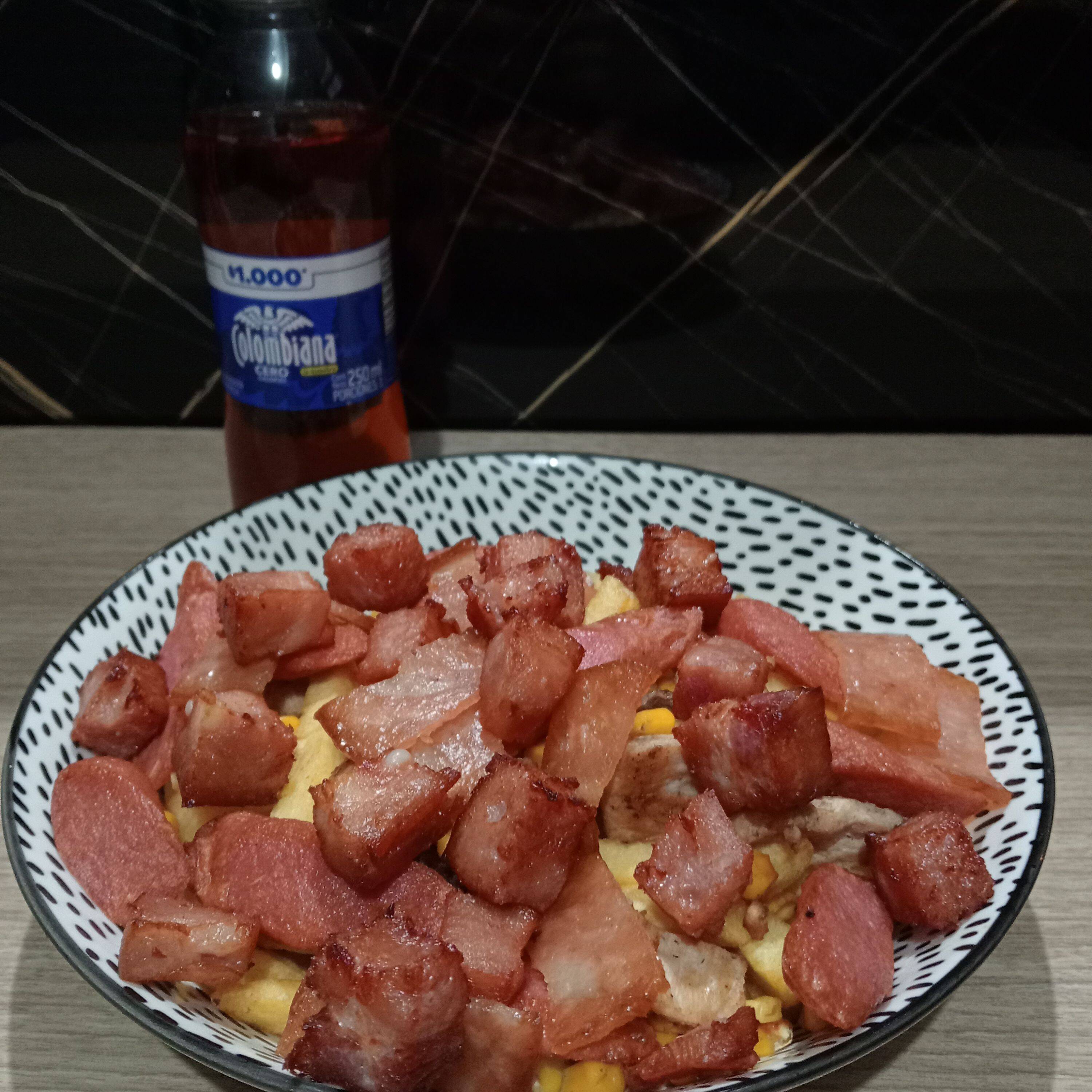 Pollo salteado, tocineta, maíz tierno, salchicha tradicional, cabello de ángel, queso costeño, salsa tomate, salsa BBQ, salsa de la casa y papa francesa.