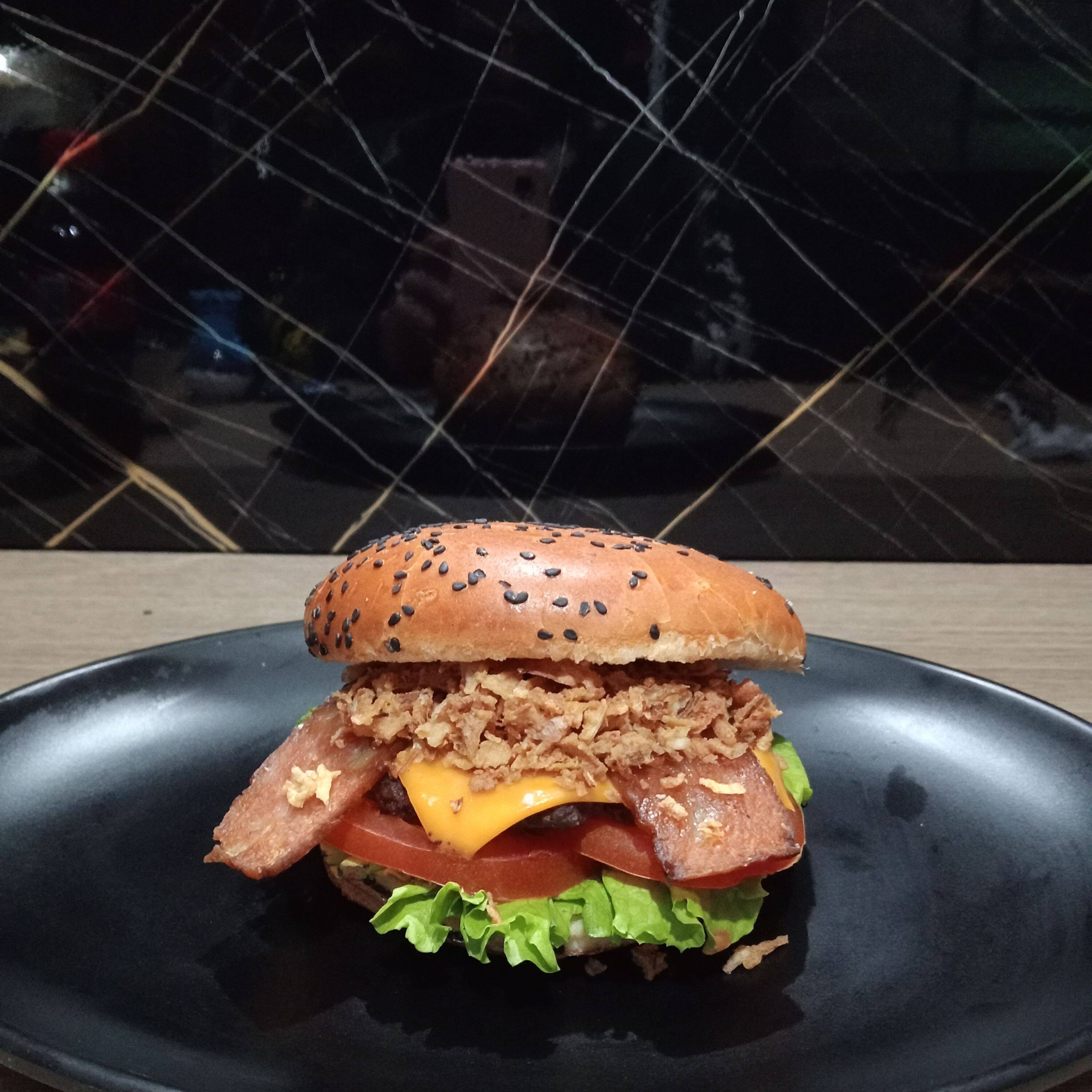 Carne artesanal 120 g, tocineta, cebolla crispy (caramelizada), pan brioche, queso doble crema, salsas (tomate, BBQ, de la casa), lechuga y tomate.