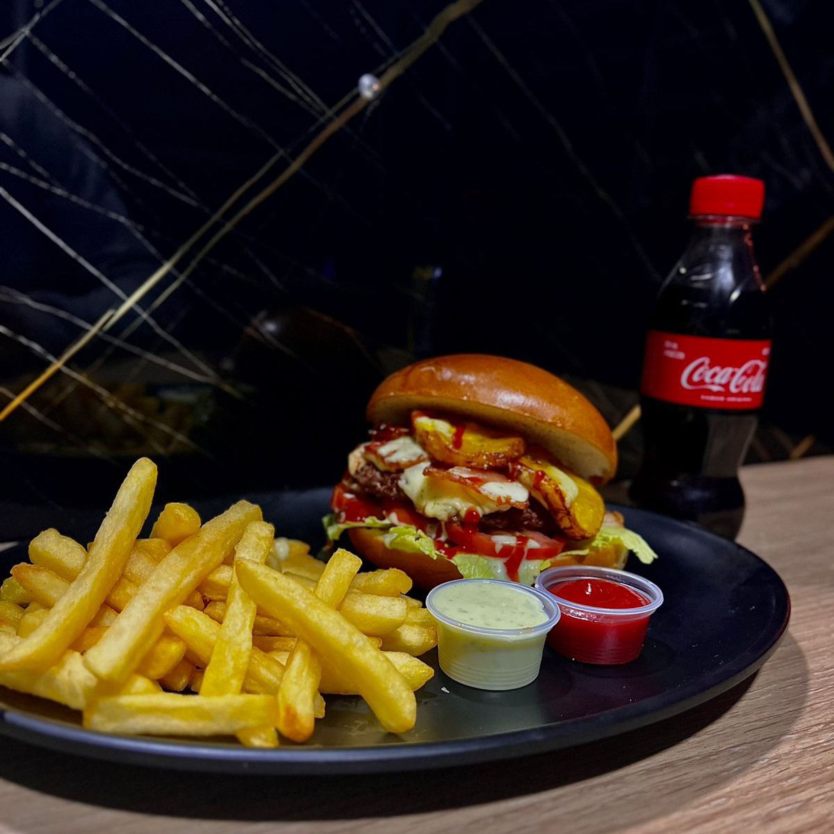 Carne artesanal 120 g, tocineta, plátano frito, queso costeño, pan brioche, queso doble crema, salsas (tomate, BBQ, de la casa), lechuga y tomate, papas a la francesa y gaseosa 250 ml (manzana, Colombiana, Pepsi).
