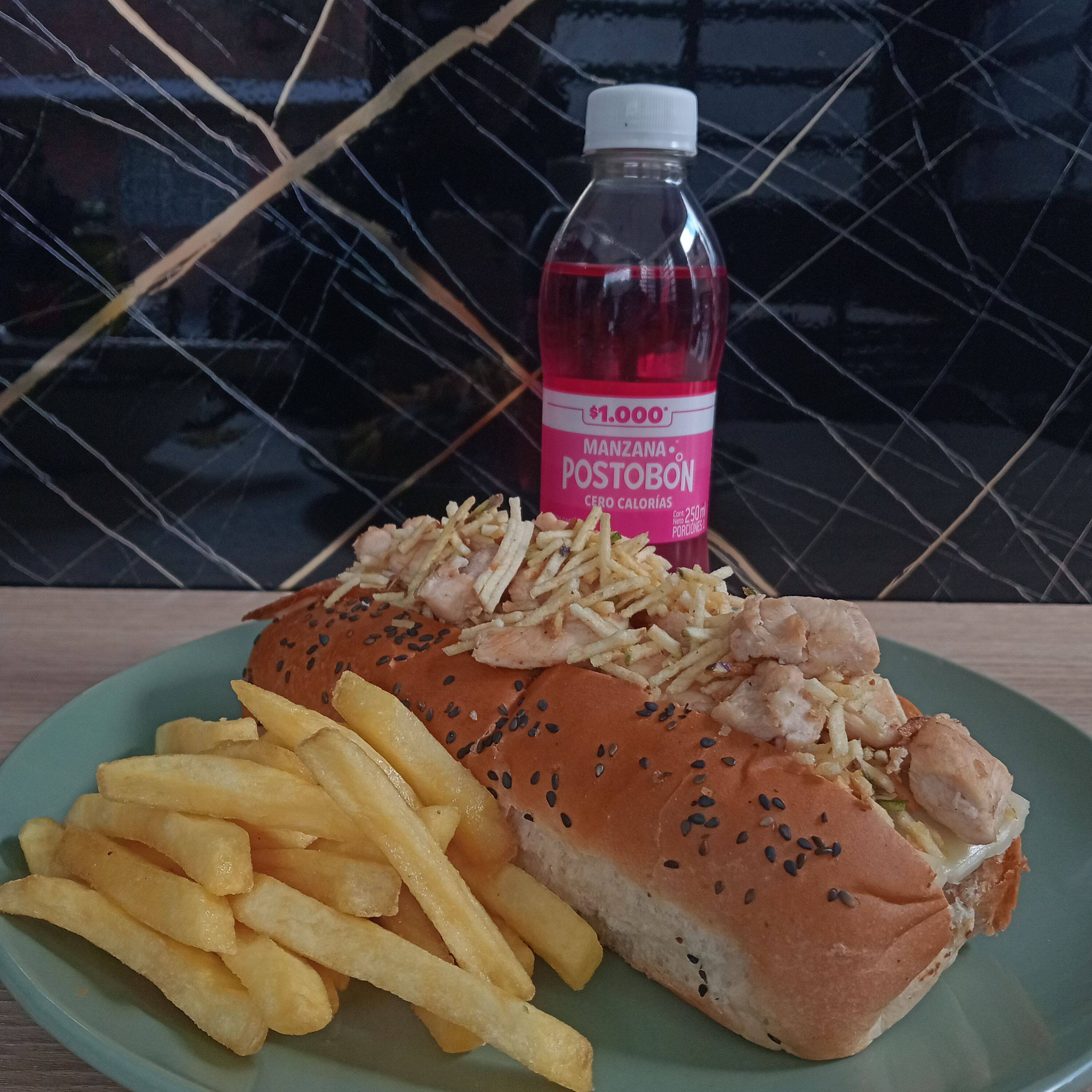 Filete de pollo 100 g, tocineta, pan brioche, queso doble crema, salsas (tomate, BBQ, de la casa), lechuga y tomate, papas a la francesa y gaseosa 250 ml (manzana, Colombiana, Pepsi).