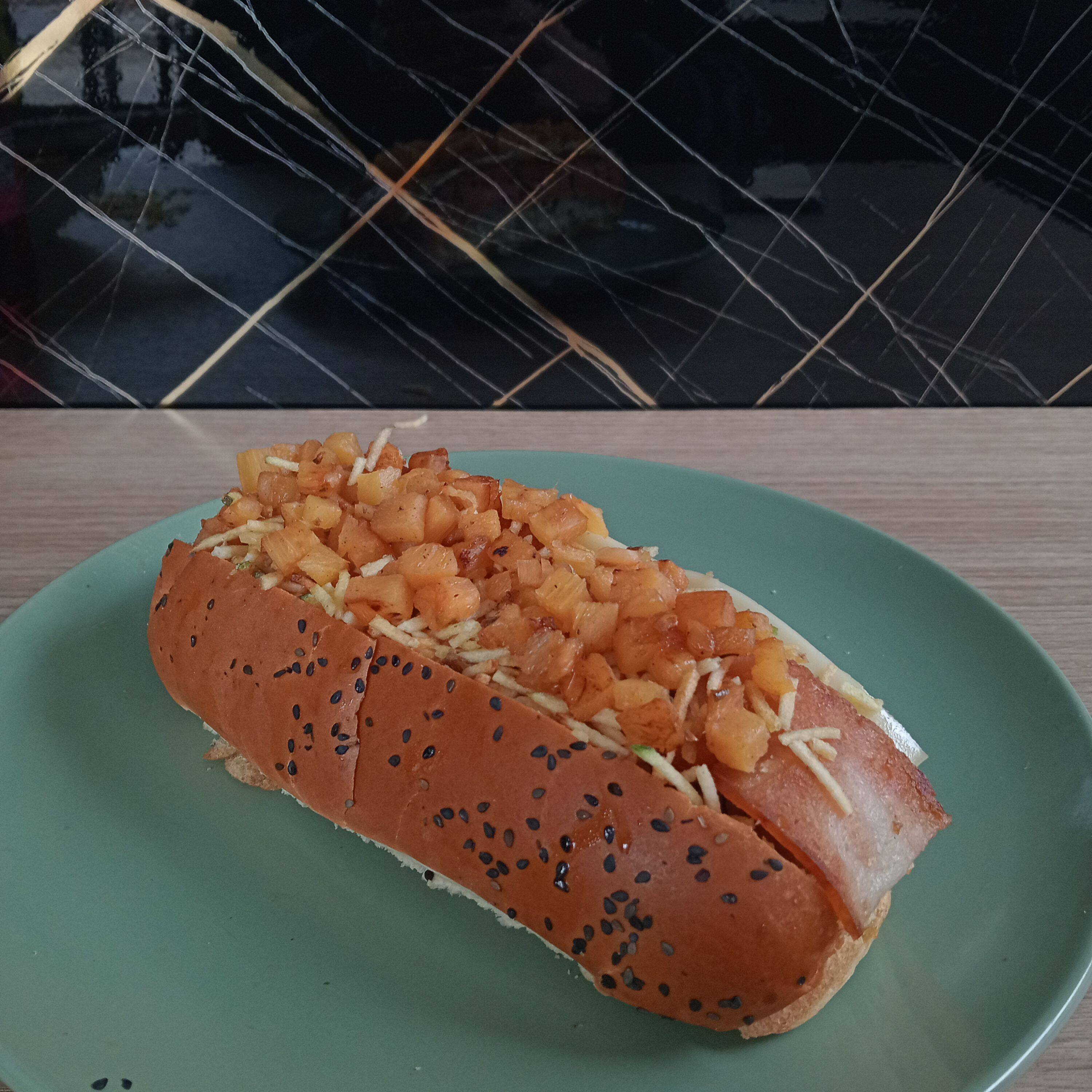 Salchicha americana, tocineta, trozos de piña, cabello de ángel, queso doble crema, salsas (tomate, BBQ, salsa de piña y salsa de ajo).