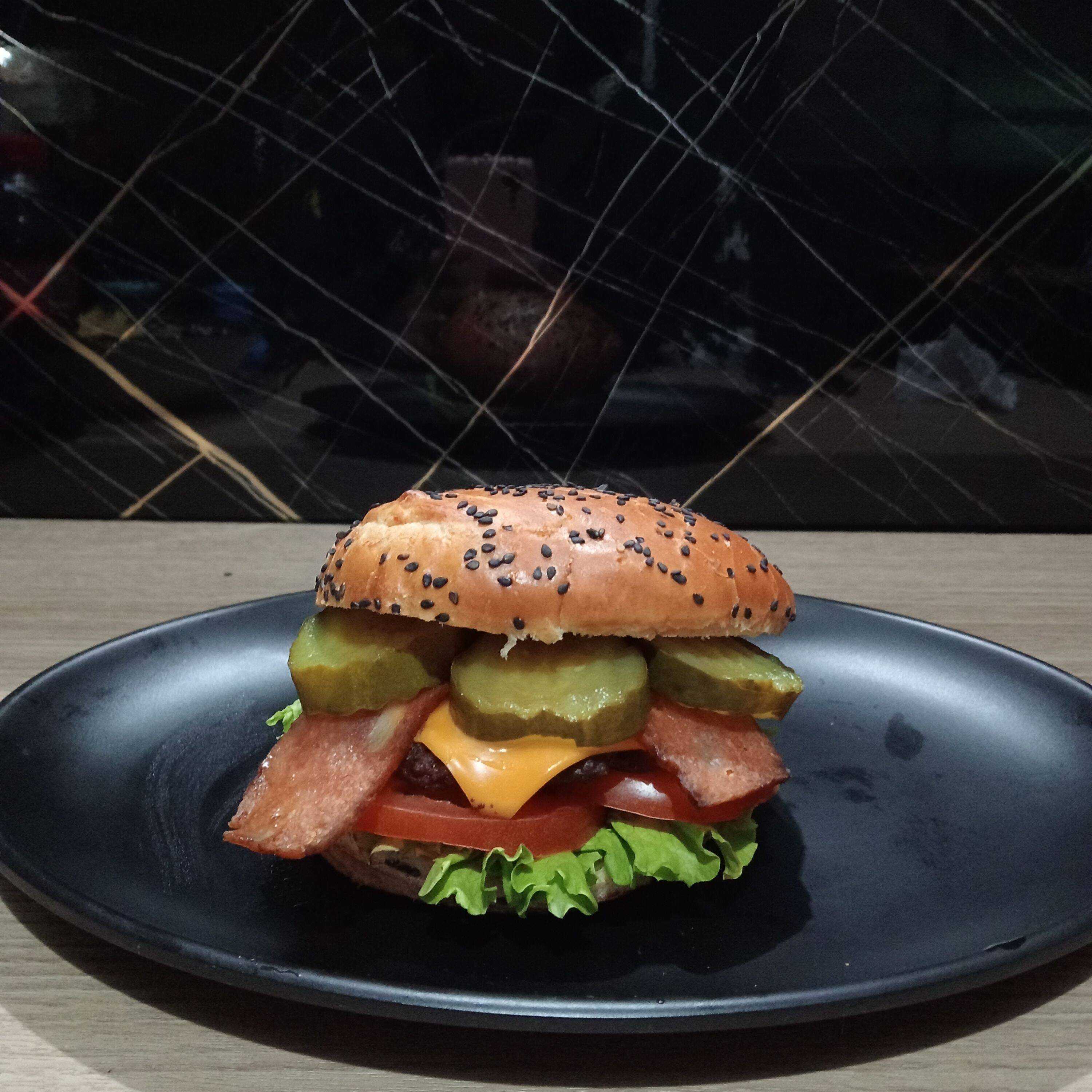 Carne artesanal 120 g, tocineta, pepinillos, queso cheddar, pan brioche, salsas (tomate, BBQ, de la casa), lechuga y tomate.