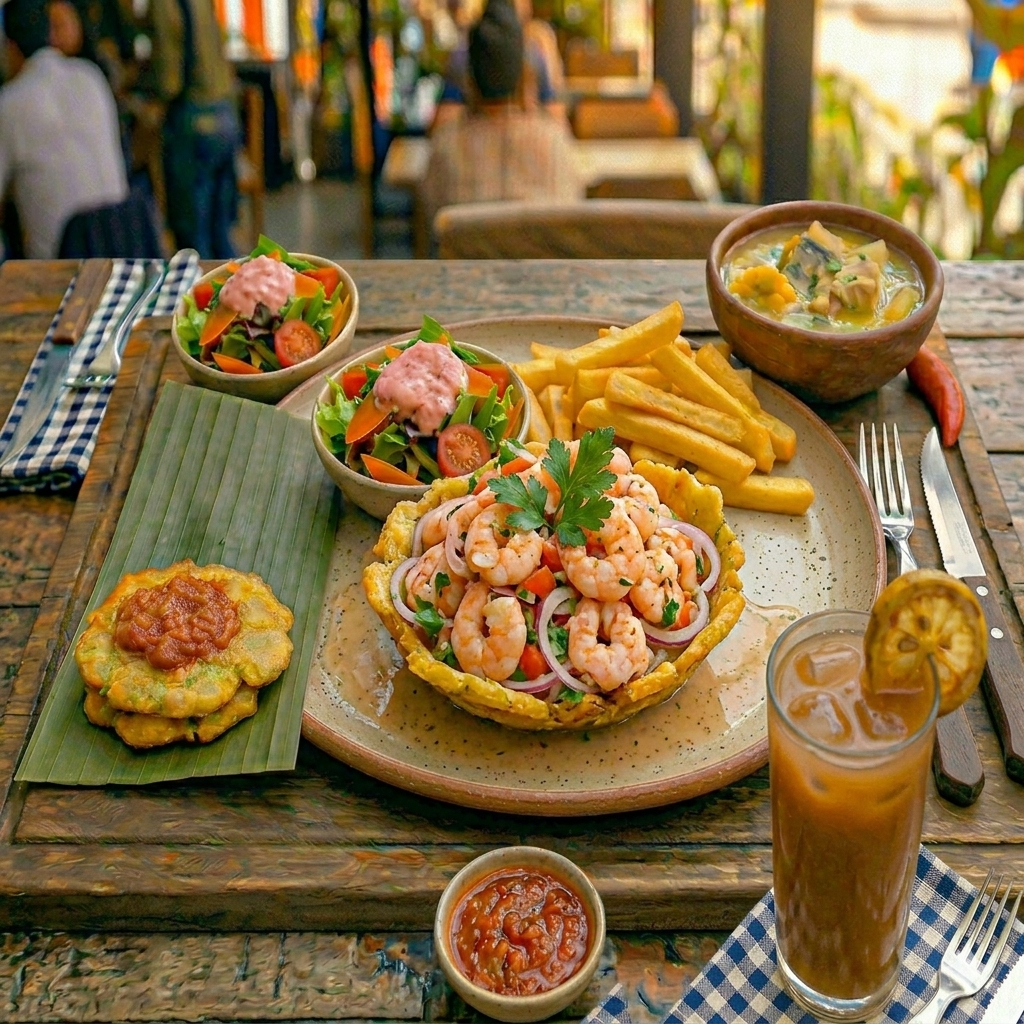 Ceviche de Camarón 180 g, Patacón y Bebida