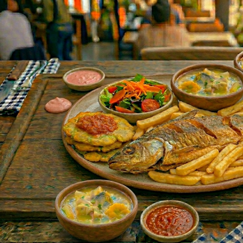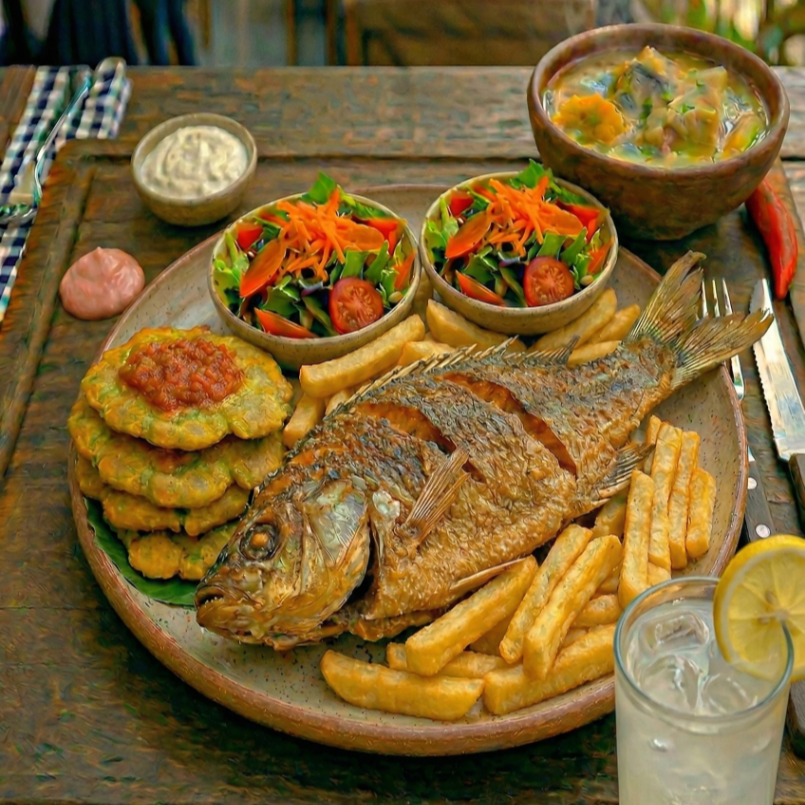 Acompañada de ensalada de la casa, patacón, papa francesa, elige tu bebida (jugo de borojó o limonada) más sancocho de pescado.