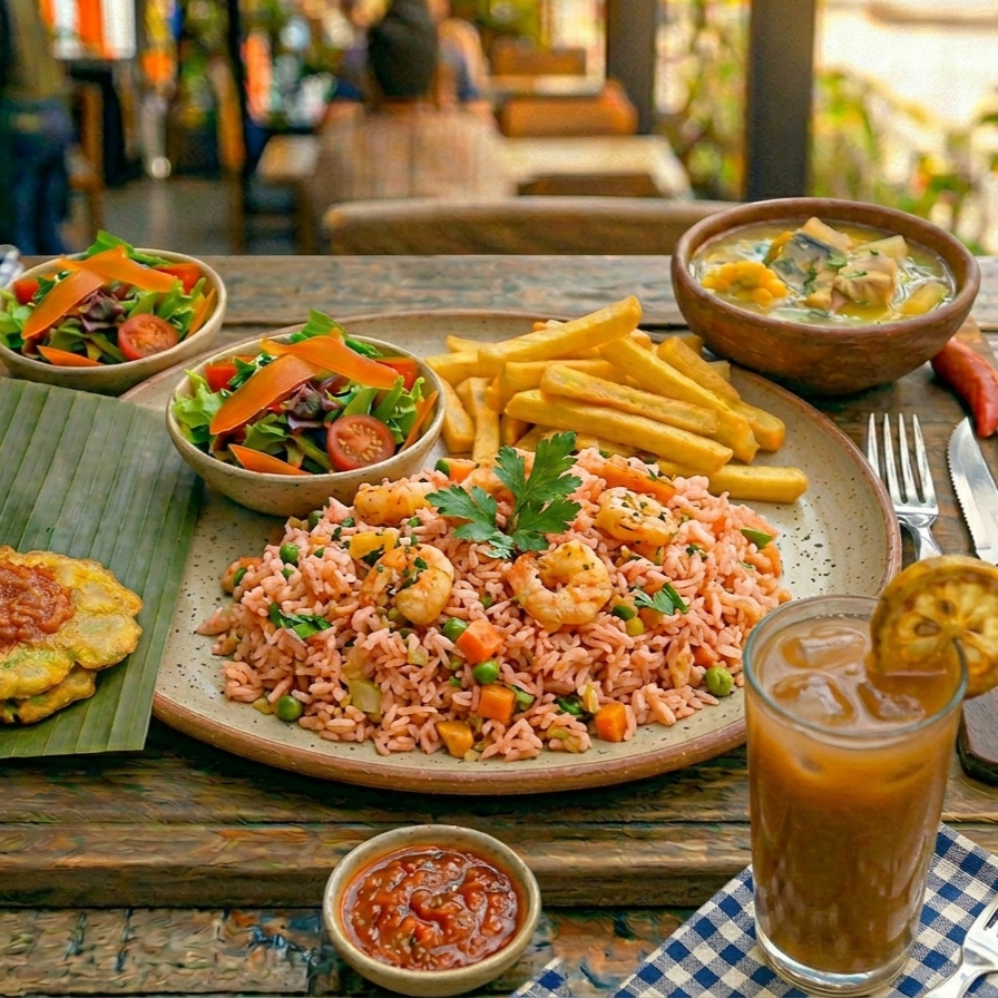 Acompañada de arroz, elige tu arroz favorito (blanco o con coco), ensalada de la casa, patacón, papa francesa, elige tu bebida (jugo de borojó o limonada) más sancocho de pescado.