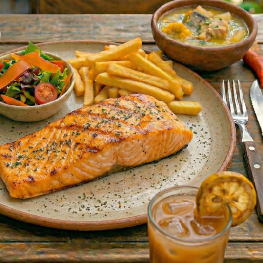 Salmón a la Plancha 280 g, Francesa, Sopa y Bebida