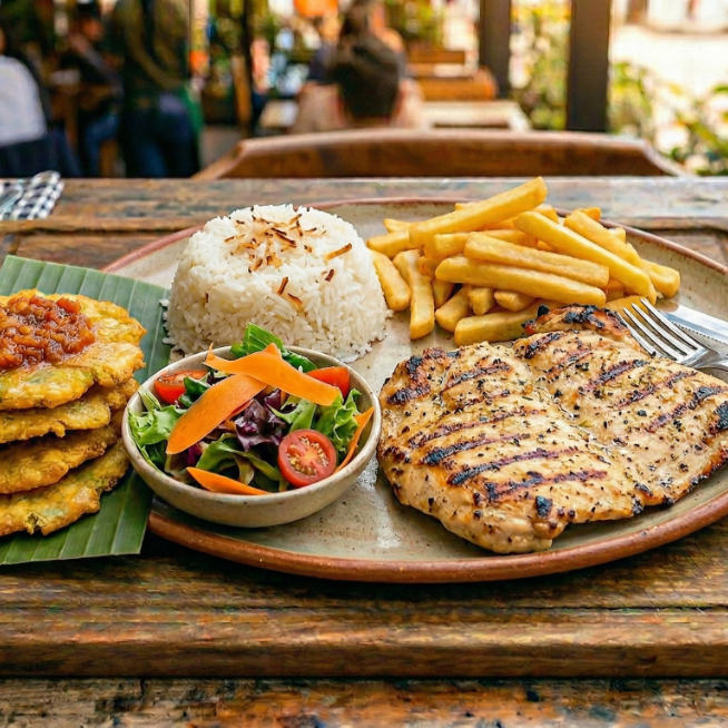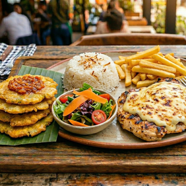 Acompañada de arroz, elige tu arroz favorito (blanco o con coco), ensalada de la casa, patacón, papa francesa.