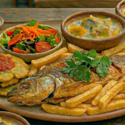 Ensalada de la casa, patacón, papa francesa, elige tu bebida (jugo de borojó o limonada) más sancocho de pescado.