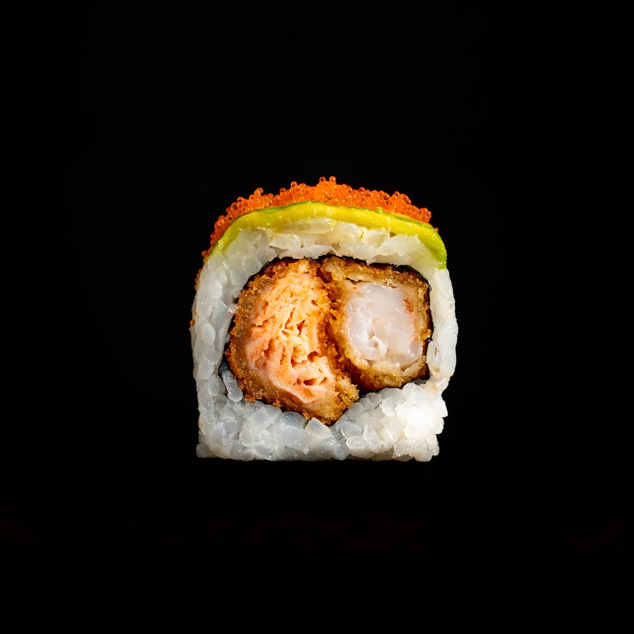 Langostino y salmón tempura, queso crema, masago, aguacate y mix de ajonjolí acompañado de salsa dinamita, gari y wasabi