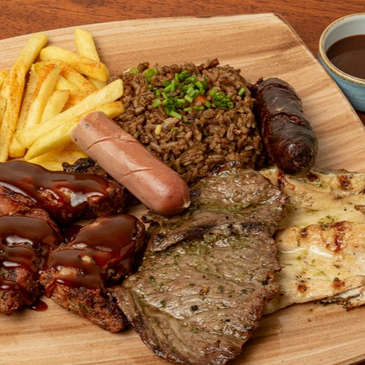 Morcilla, chorizo, lomo de res y cubitos de pollo costilla de cerdo carne de res. Acompañadas de patacones, papa criolla frita, picante y crema de aguacate.