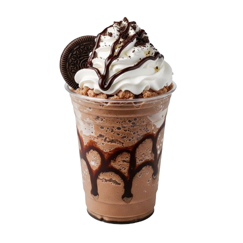 Frappe de Oreo, dulce con galleta de oreo triturada en el interior, chocolate en crema decorando el vaso y en la punta crema chantilly con moronas de galleta oreo y una galleta decorativa en la parte superior