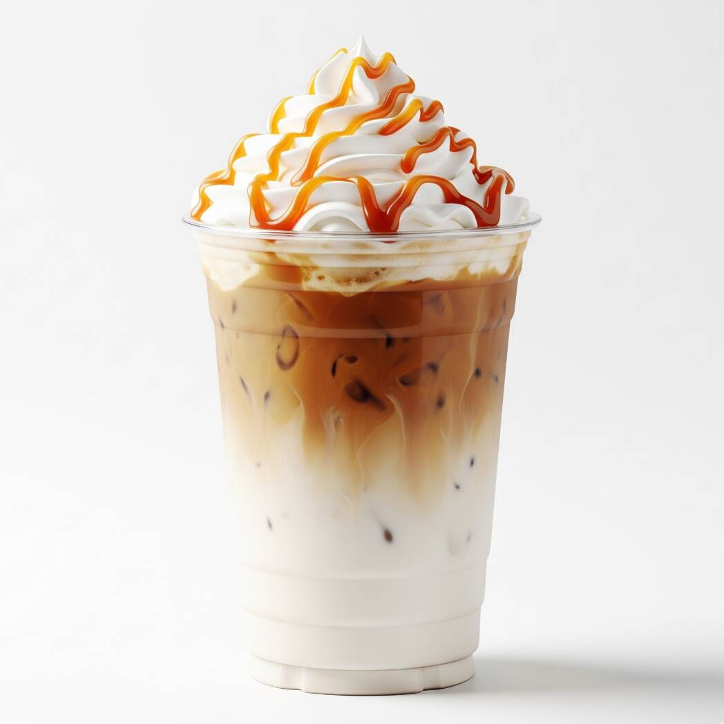 Bebida de caramelo leche y café helado con decoración de crema de caramelo al rededor del vaso