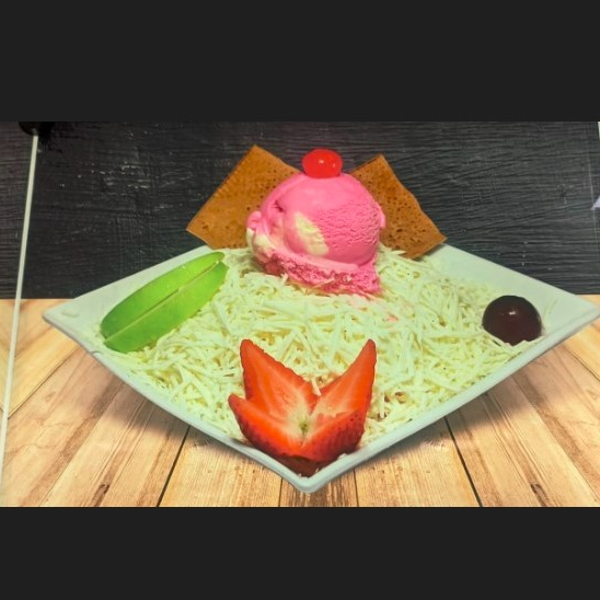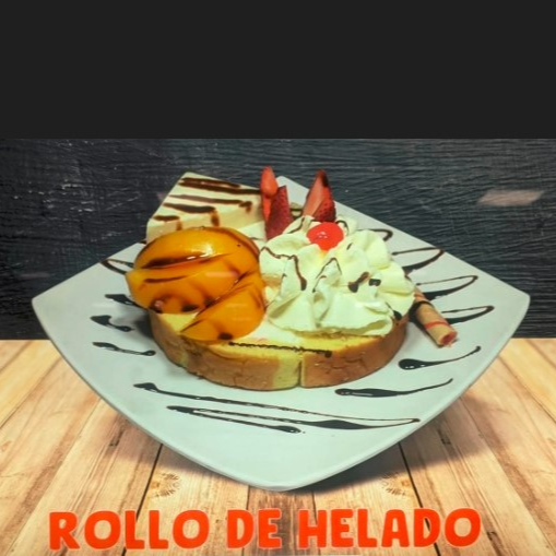Durazno, fresas, arequipe, helado ,queso , chantilly, barquillo lluvia de chocolate.