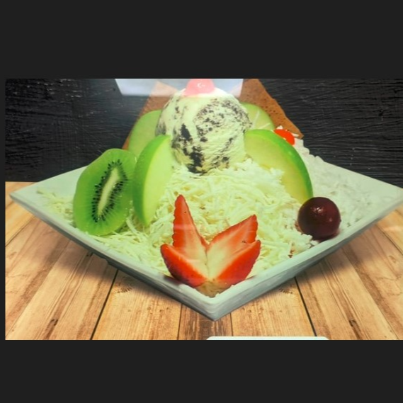 Crema Baileys, chantilly, helado, manzana, durazno, fresa, kiwi, y Hershey´s de chocolate.