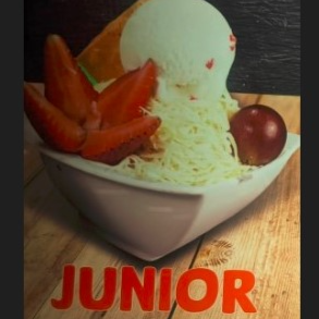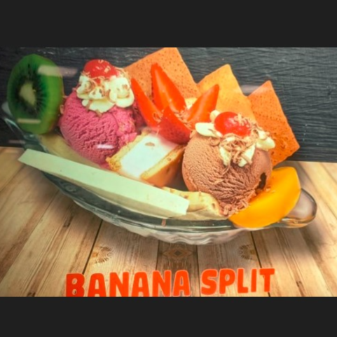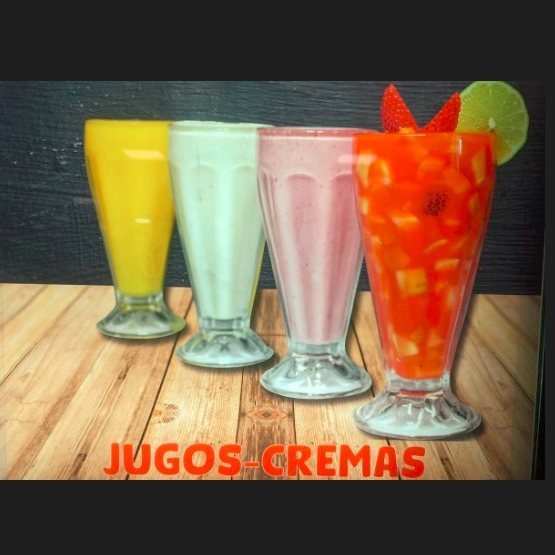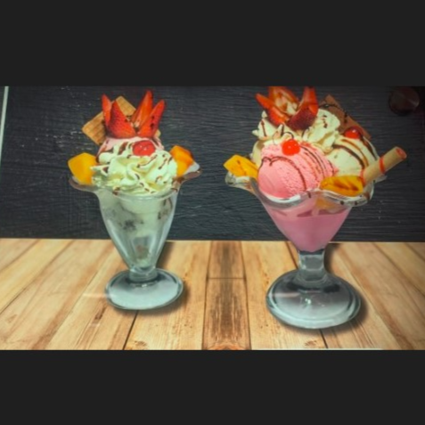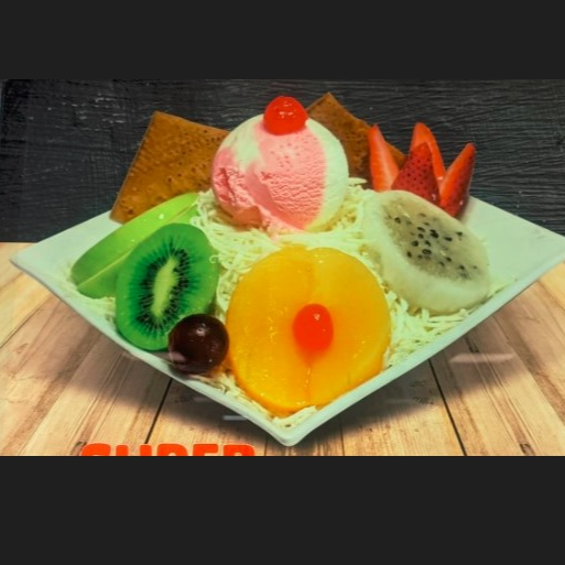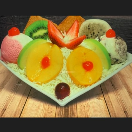 Fruta picada (doble durazno, kiwi, pitahaya, cereza, fresa), crema de leche, queso rallado, doble helado (vainilla, fresa, limón o chocolate), galleta y miel.