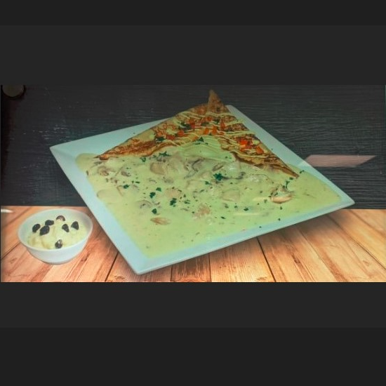 Centro de cadera, champiñón, queso, cebolla en juliana, salsa bechamel y ensalada dulce con pasas