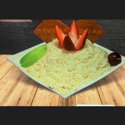 Salsa frutos rojos, chantilly, helado cereza, queso y lluvia dulce.