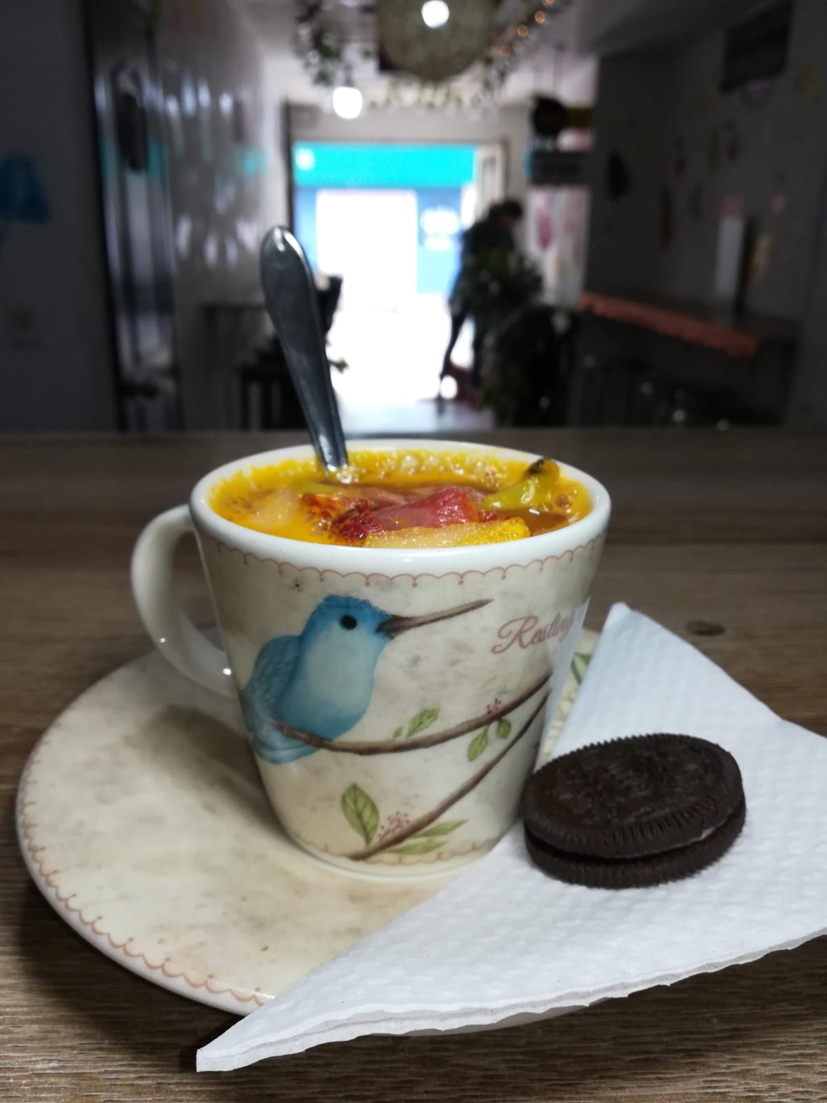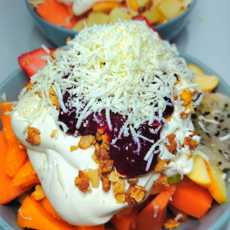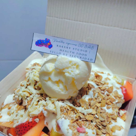 Natural y deliciosa ensalada de frutas con crema blanca, queso campesino, miel, granola, dulce de mora con fruta natural, trozos de banano, papaya, melón, fresas y helado.
