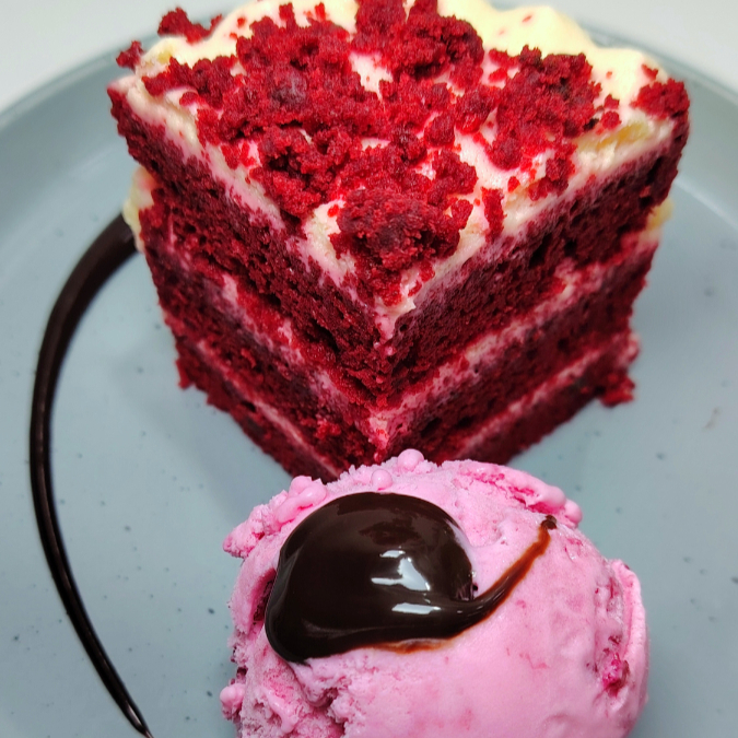Torta de red velvet esponjosa con frosting de queso crema, peso aproximado por tajada 140 g.