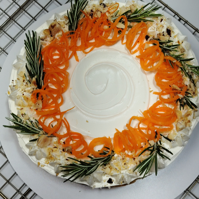 Torta con receta tradicional con zanahorias frescas, peso aproximado por porción de 110 g. Advertencia: este producto contiene trigo, lácteos y huevos.