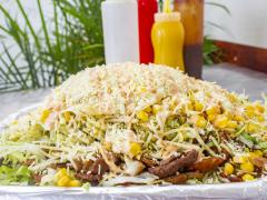 Doble carne 100% de res, carne desmechada, pollo desmechado, papa chips, queso doble crema, huevo, jamón, vegetales frescos y salsas de la casa.