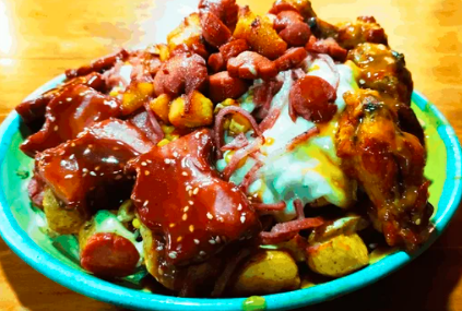 300g De papa francesa, salchicha americana, pollo desmechado, champiñón, tocineta, queso doble crema, huevo, vegetales y salsas.