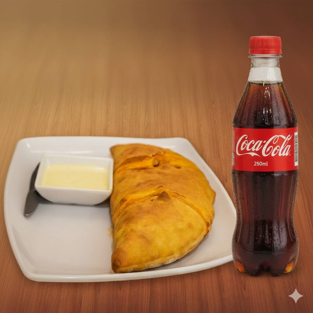 Queso mozzarella, queso crema, jamón, chorizo, tocineta, maíz y salsa napolitana + 1 Coca Cola 250 ml.