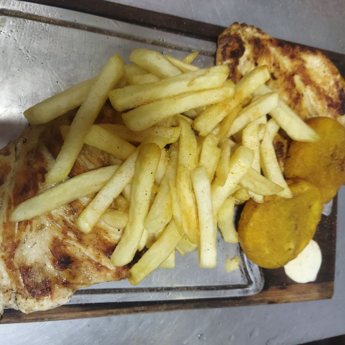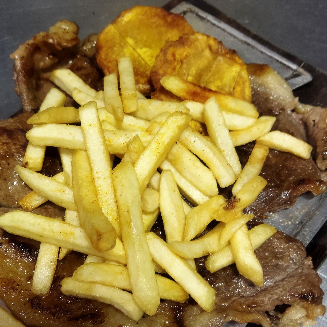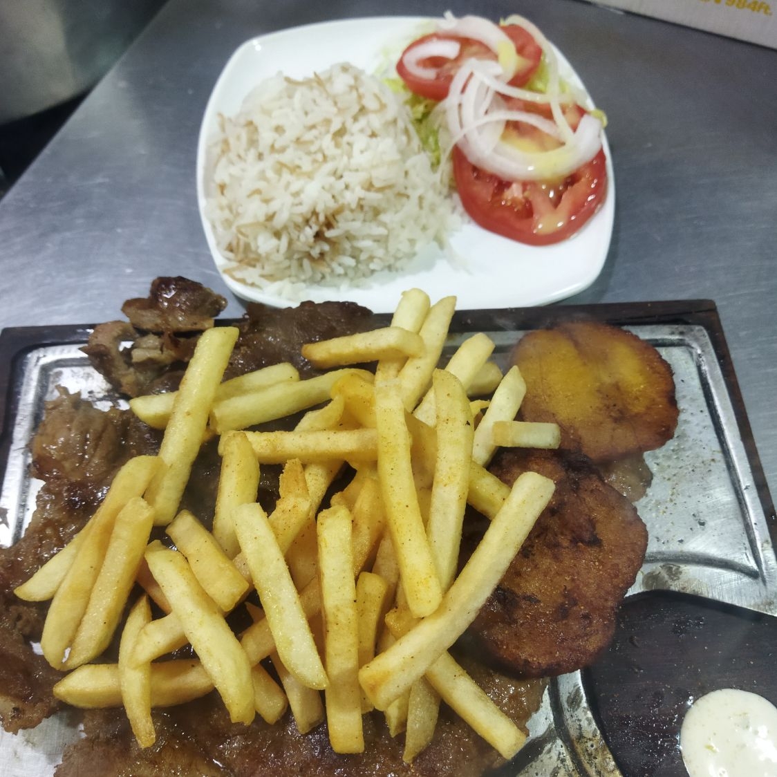 Churrasco 3 cuartos de lb, ensalada (tomate, cebolla, lechuga y salsa de vinagre), patacón y papa a la francesa.
