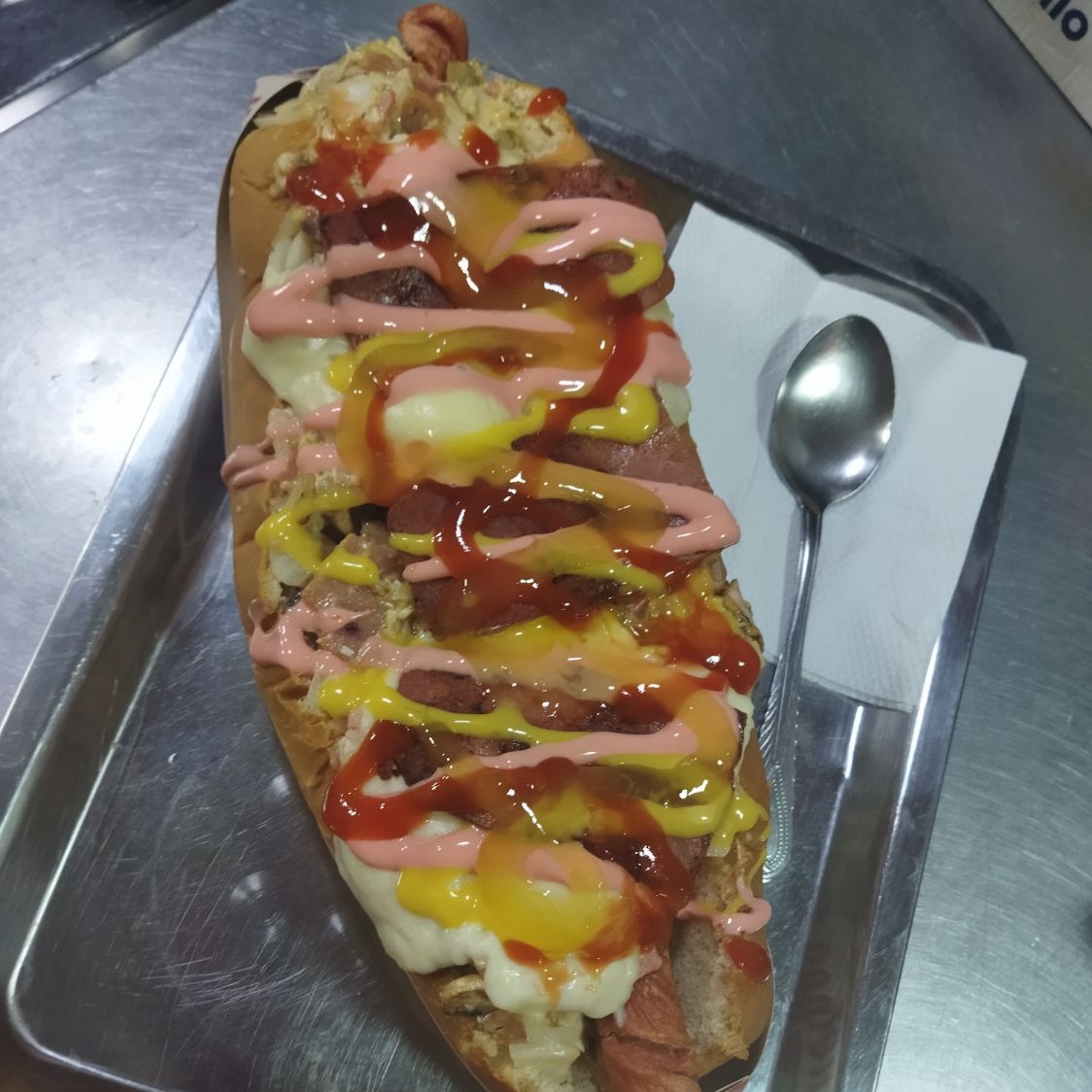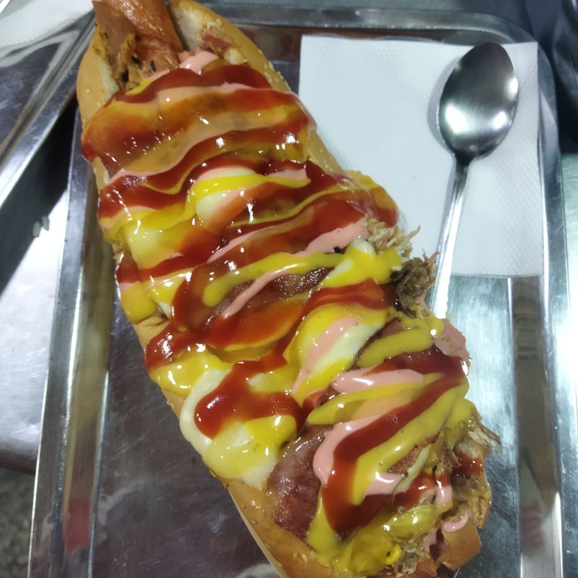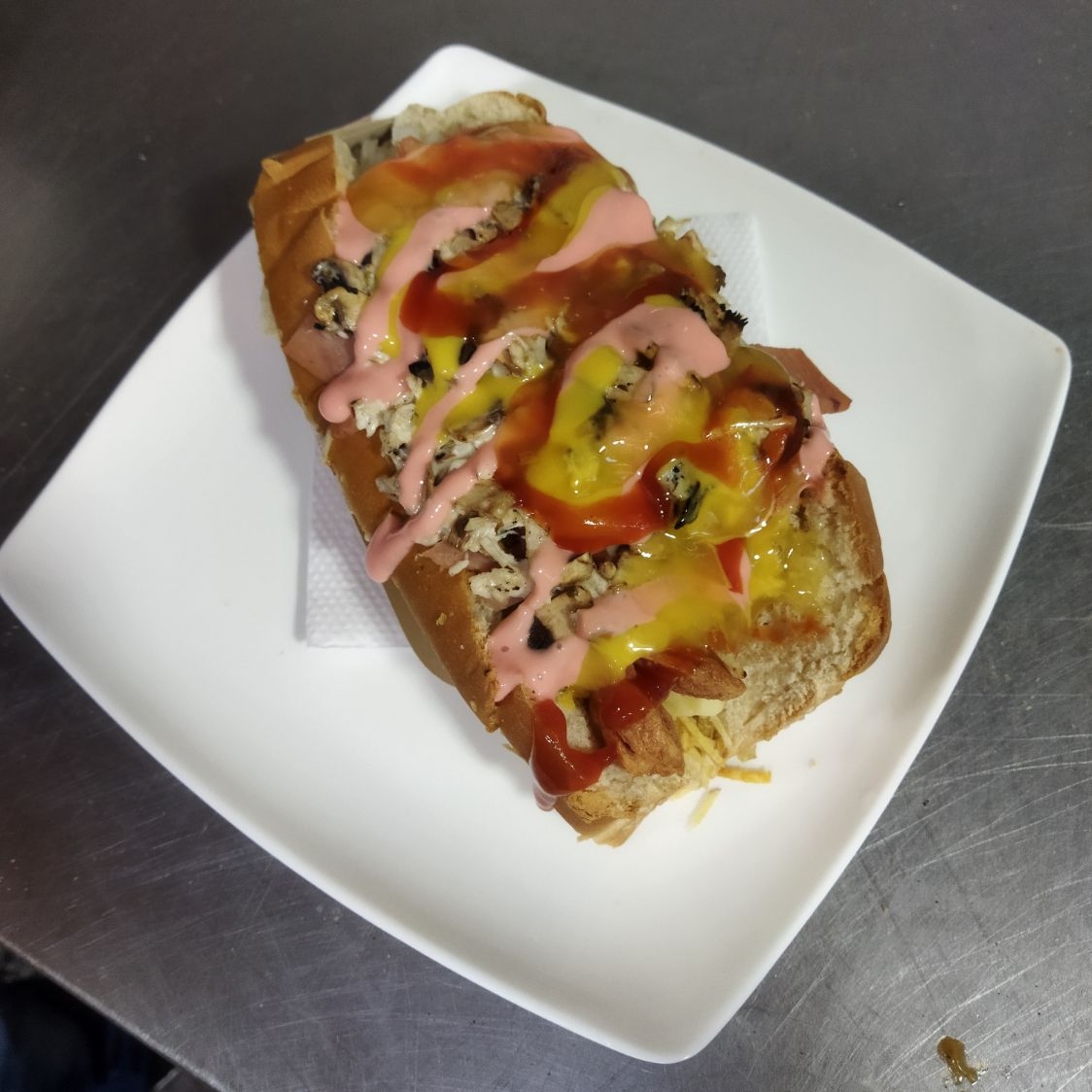 2 Salchichas, cebolla, pollo, maíz, tocineta, jamón, mortadela, carne desmechada, 5 huevos de codorniz, queso y salsas (tomate, tártara, mayonesa, piña, mostaza, ajo).