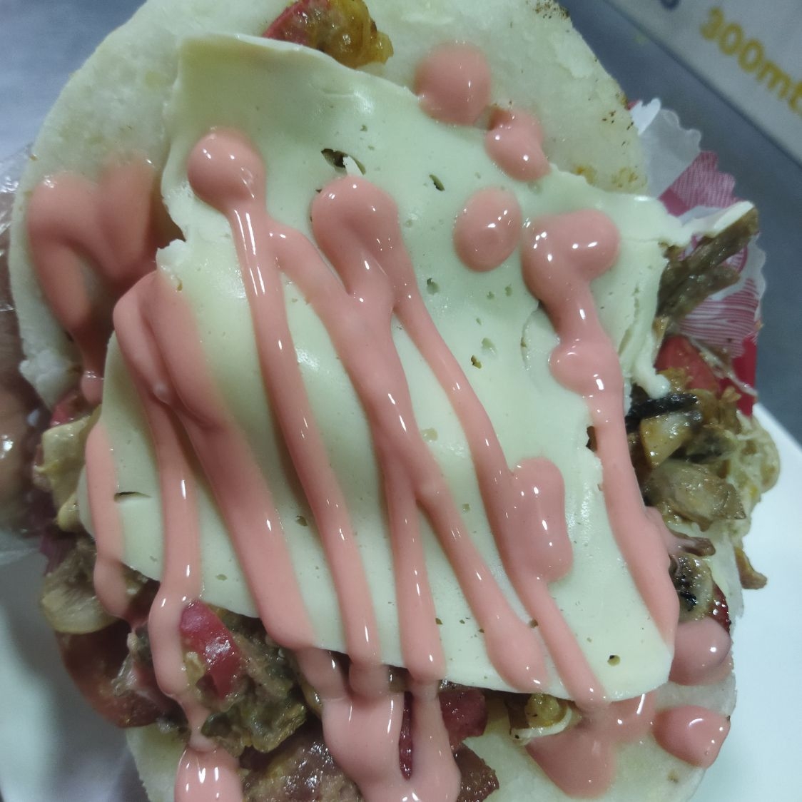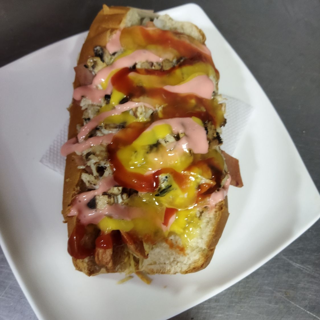 Carne de res, queso, lechuga, tomate, cebolla, jamón, mortadela, pollo, champiñón y salsas (tomate, tártara, mayonesa, piña, mostaza, ajo).