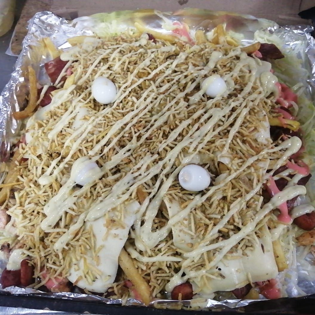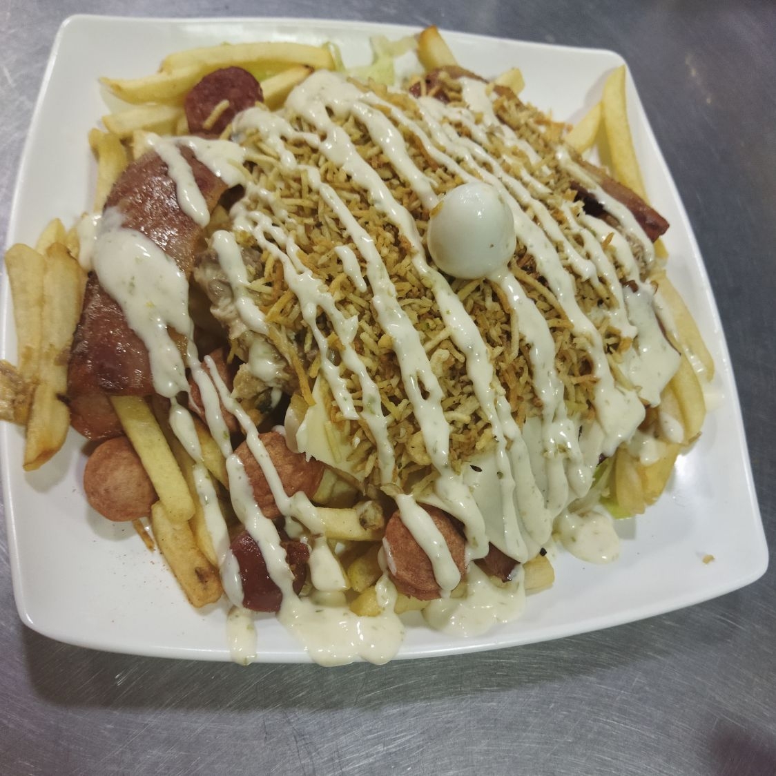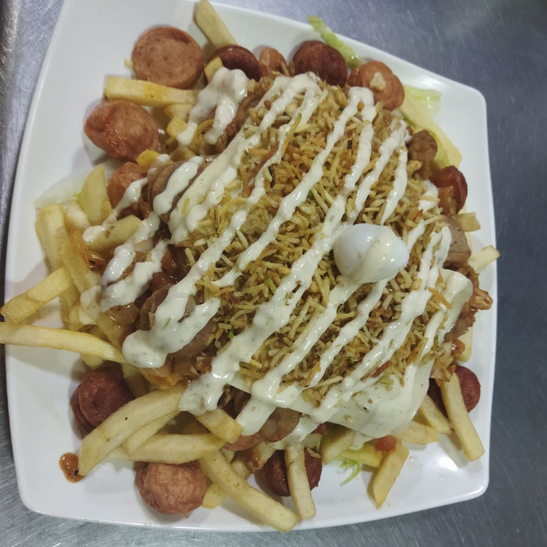2 Porción de papa a la francesa, 1 salchicha americana, chorizo, pollo, carne desmechada, tocineta, lechuga, huevo de codorniz, queso, salsas (tomate, tártara, mayonesa, piña, mostaza, ajo) y papa chip.