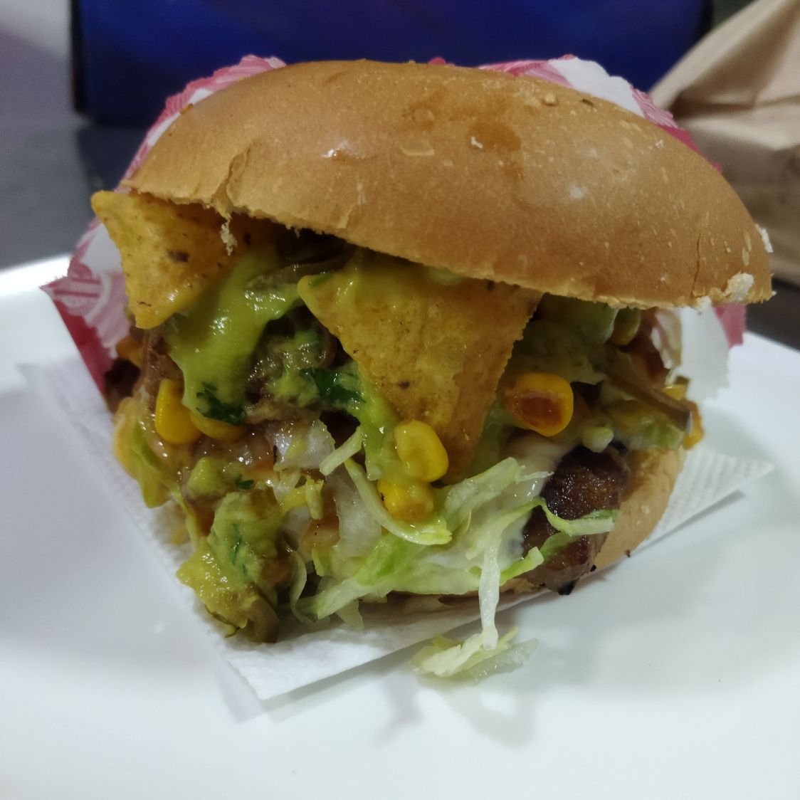 Carne, queso, lechuga, tomate, cebolla, guacamole, maíz, carne desmechada, jalapeño y salsas (tomate, tártara, mayonesa, piña, mostaza, ajo).