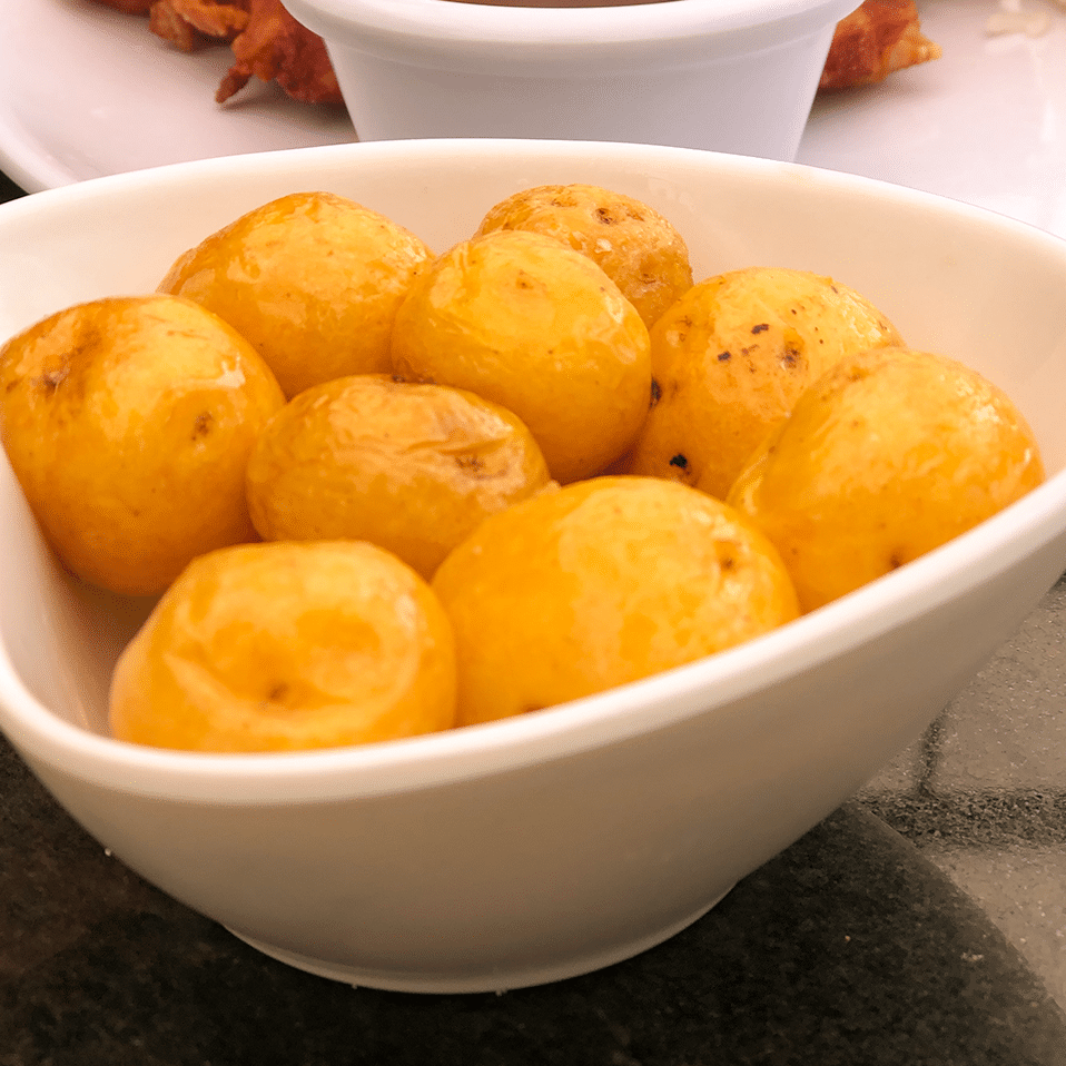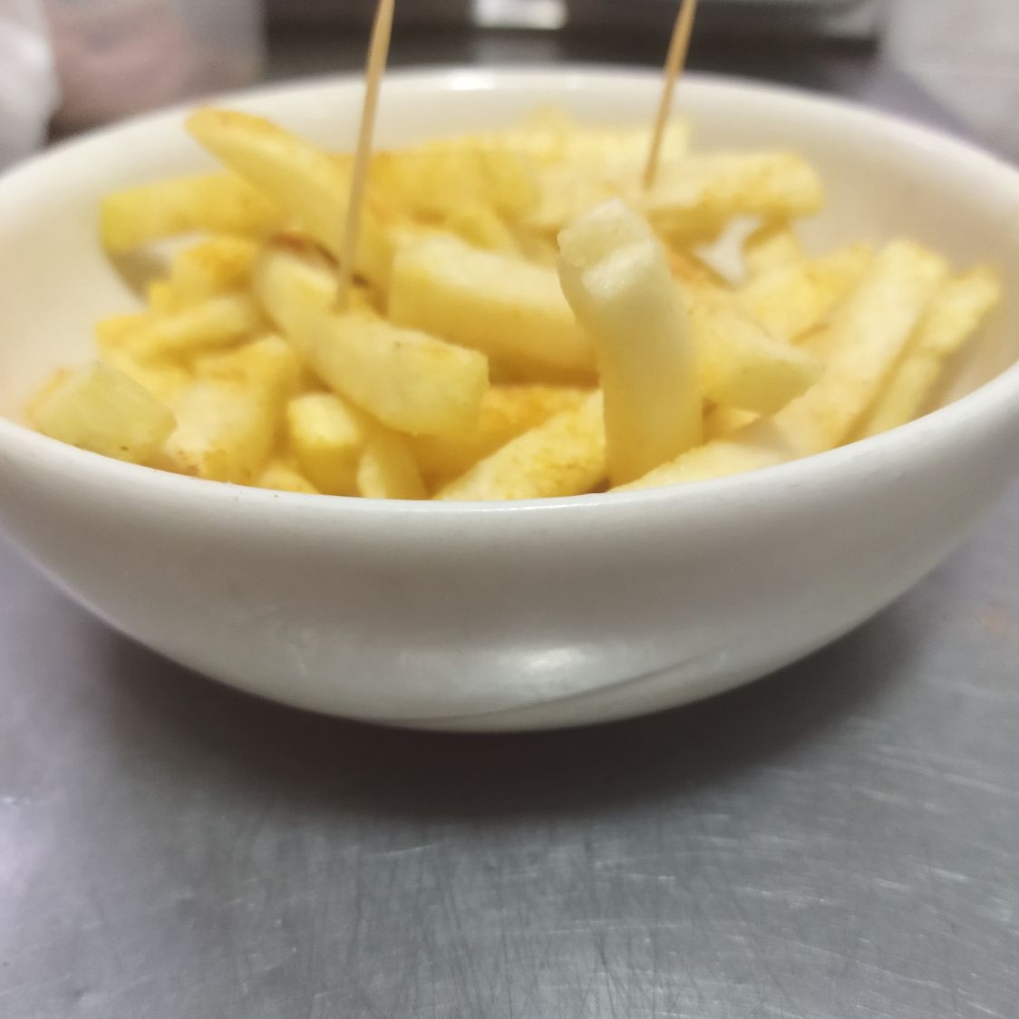 2 Pinchos de pollo apanado y 1 porción de papa a la francesa.