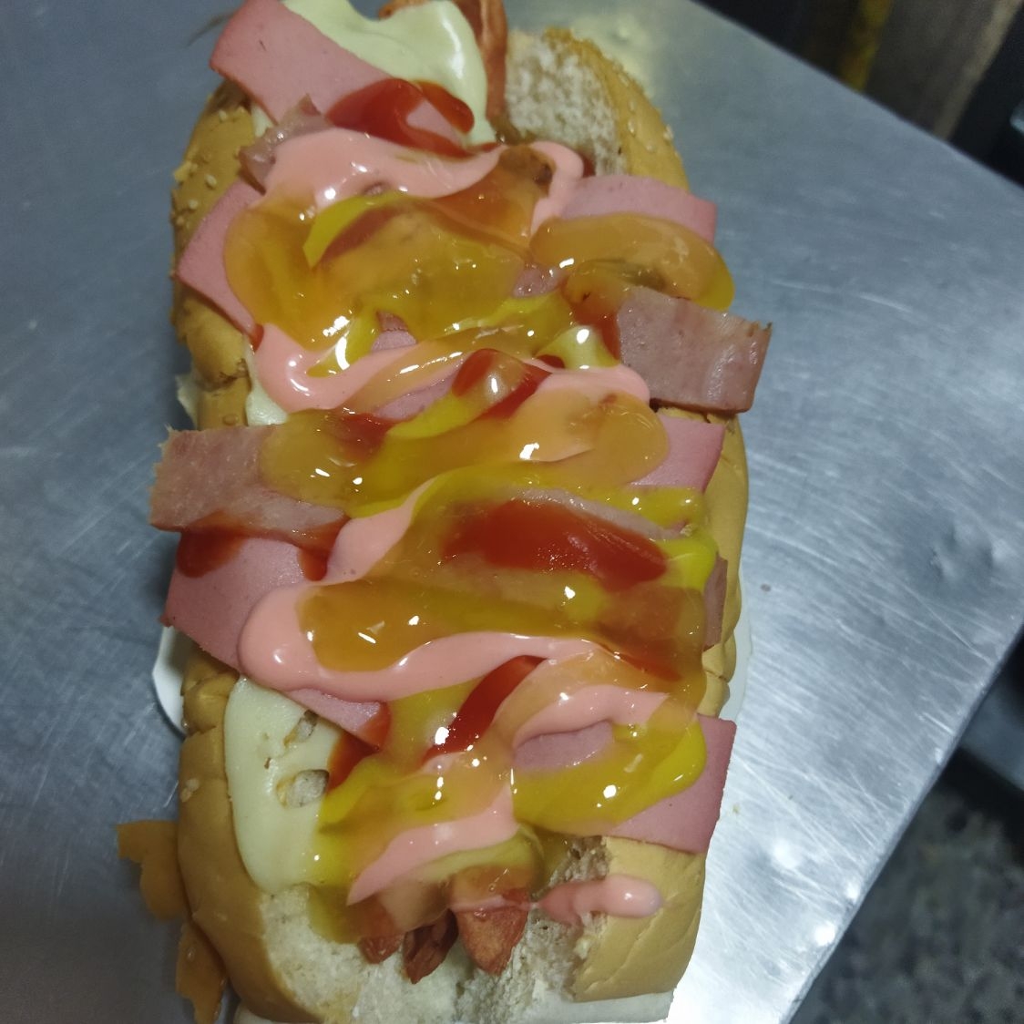 2 Salchichas, jamón, mortadela, queso, salsas (tomate, tártara, mayonesa, piña, mostaza, ajo) y papa chip.