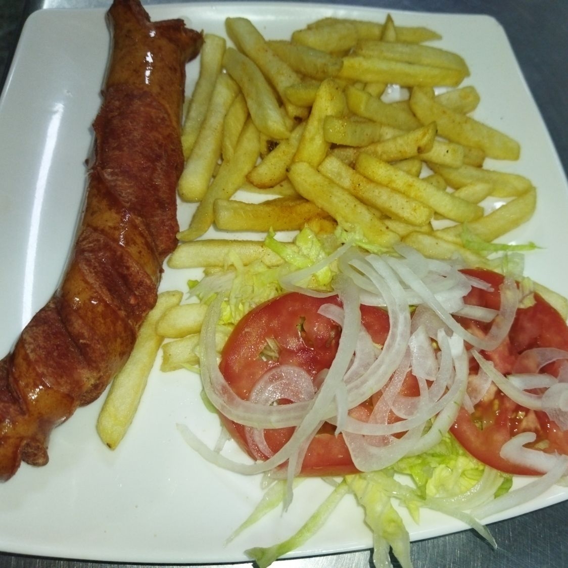 1 Chorizo, ensalada (tomate, cebolla, lechuga y salsa de vinagre) y porción de papa a la francesa.
