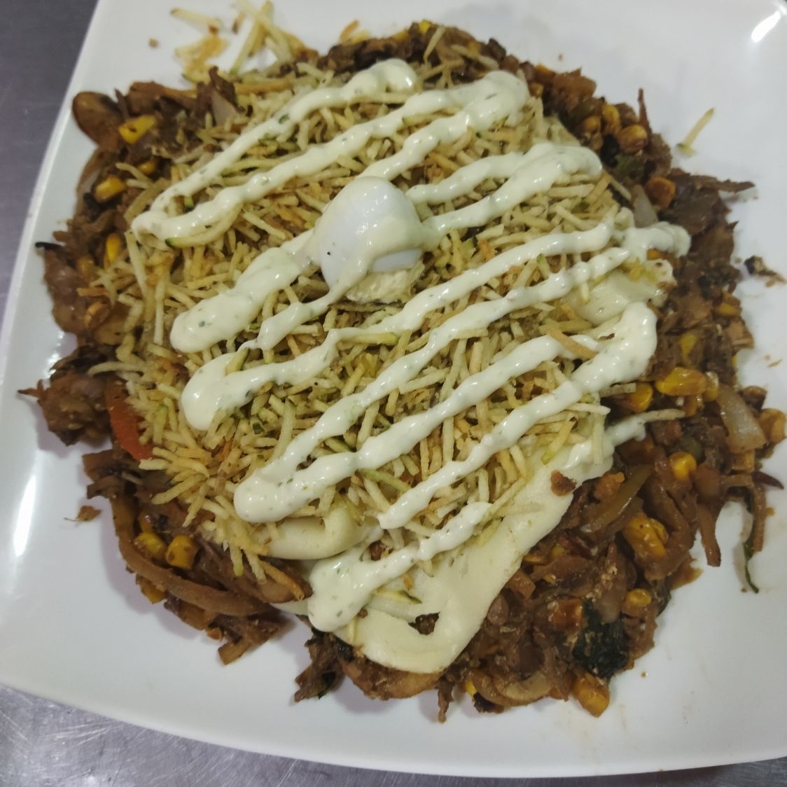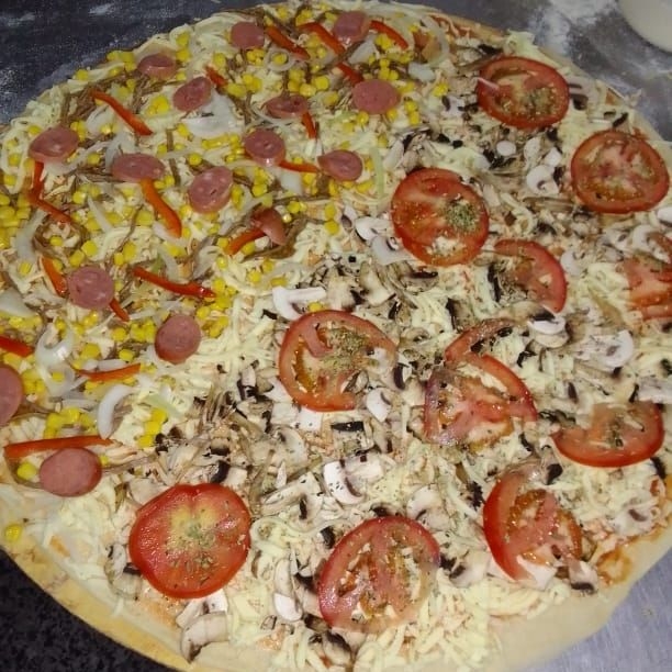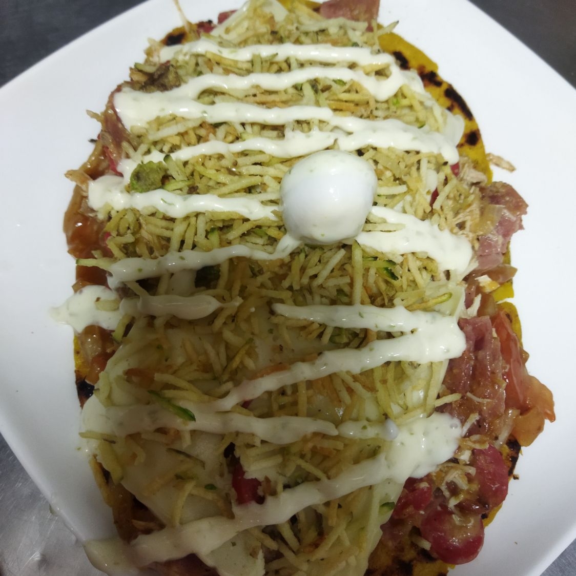 Maíz, cebolla, pimentón, espinaca, champiñón, orégano, 1 huevo batido de gallina, aceituna, queso, papa chip y salsas (tomate, tártara, mayonesa, piña, mostaza, ajo).